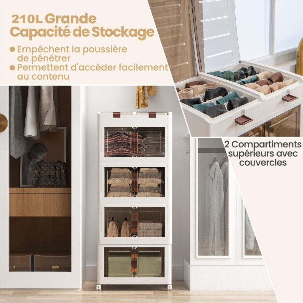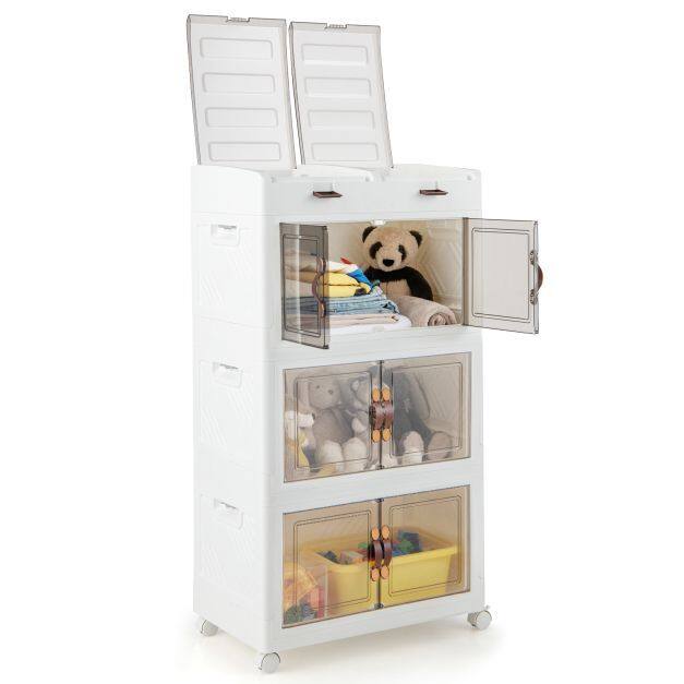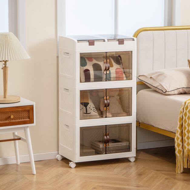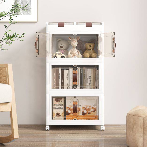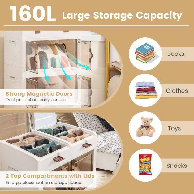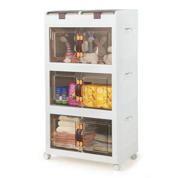 When needed, simply expand and use them as a convenient storage solution. When not in use, the storage boxes can be collapsed for compact storage. There are 3 stackable plastic bins and 2 top compartments to create a coordinated organization, including clothes, snacks, and books, etc. Besides, the closet storage organizer features front-opening magnetic doors, providing quick and easy access to your items. More, 4 wheels allow you to effortlessly move them around your home. Simplify your storage needs with these functional and versatile storage bins! If you are looking for such a product, do not hesitate to buy it!