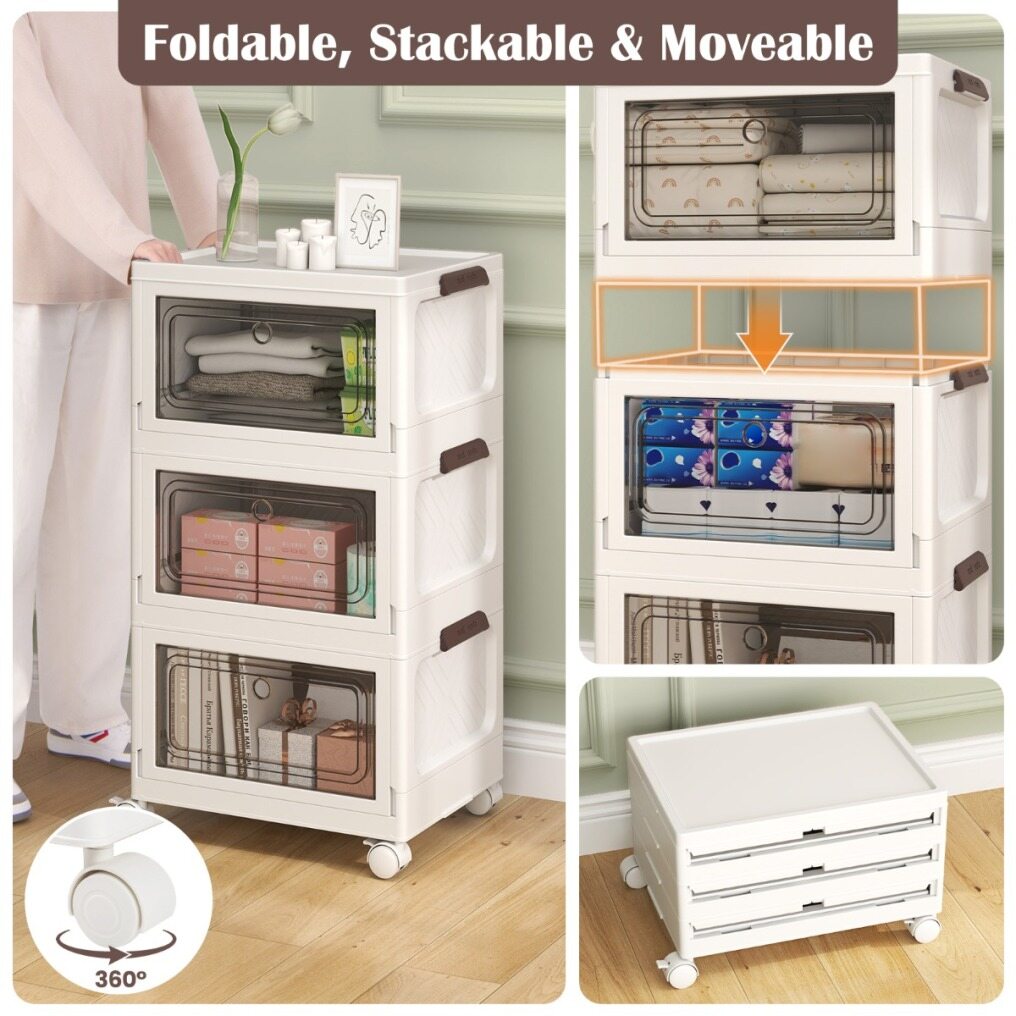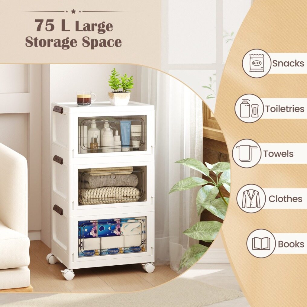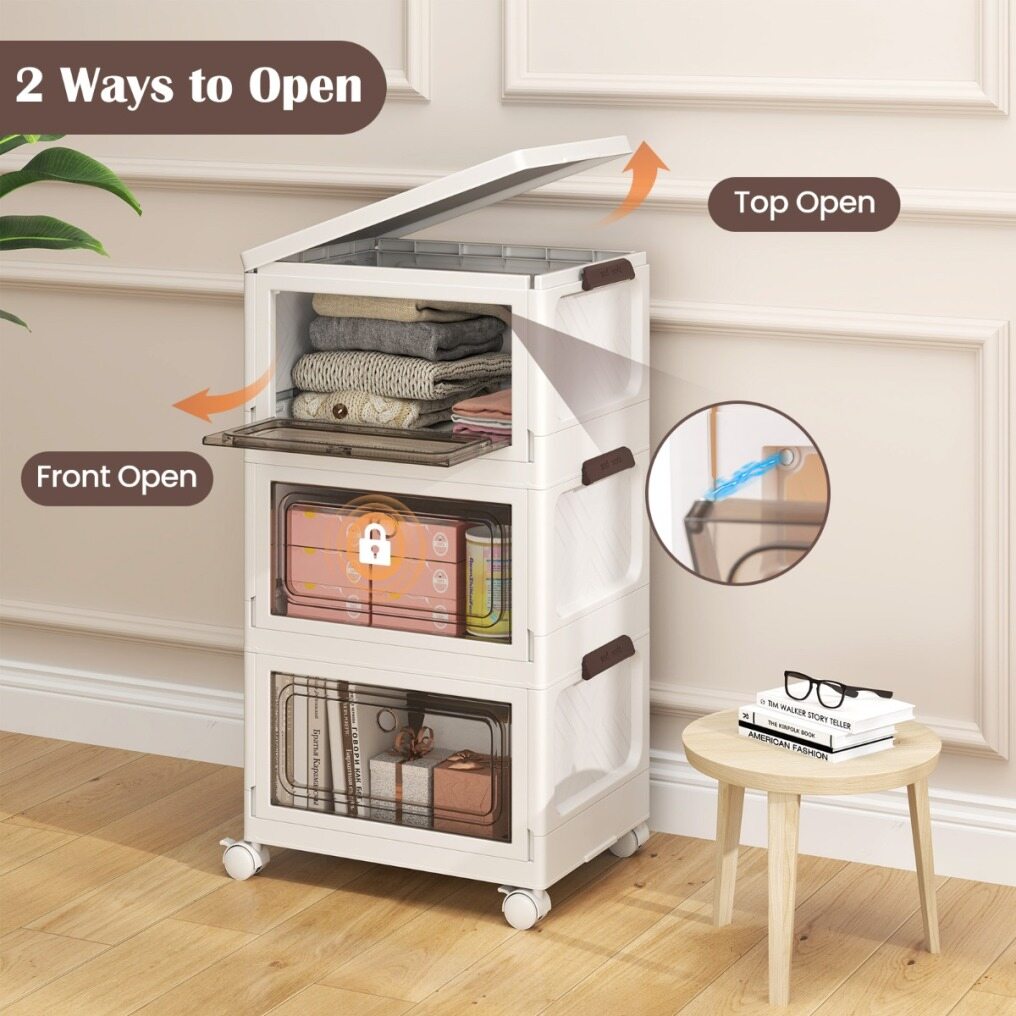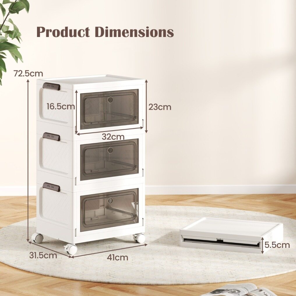 Quick and easy to assemble, these PP storage bins make the most of your vertical space, offering a substantial combined capacity of up to 75/105 L. Plus, each bin folds down to a slim height of just 5.5/5.5 cm, perfect for tucking away until their next use. Designed with clear doors, these storage boxes allow you to spot your items at a glance, while the top lids provide an extra access point for grabbing what you need. Roll these space-savers on their 4 universal wheels to any room in need of a tidy-up, and with 2 lockable wheels, you can secure them in place once you've found the perfect spot. Enjoy sleek and organized storage today!