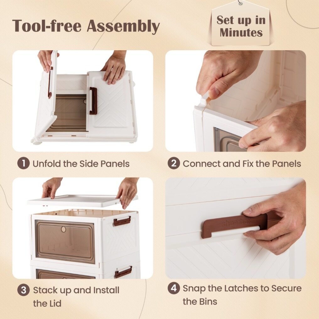 Tool-Free Assembly: Say goodbye to complicated assembly with an arsenal of tools. With a tool-less setup process in just a few steps, you can start organizing with this storage bins in no time. Note: Please snap the latches on both sides to secure the bins in place.