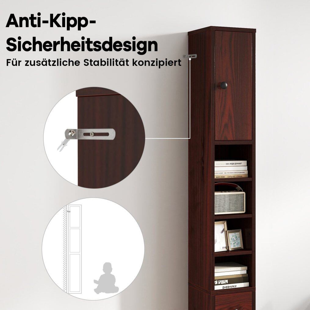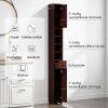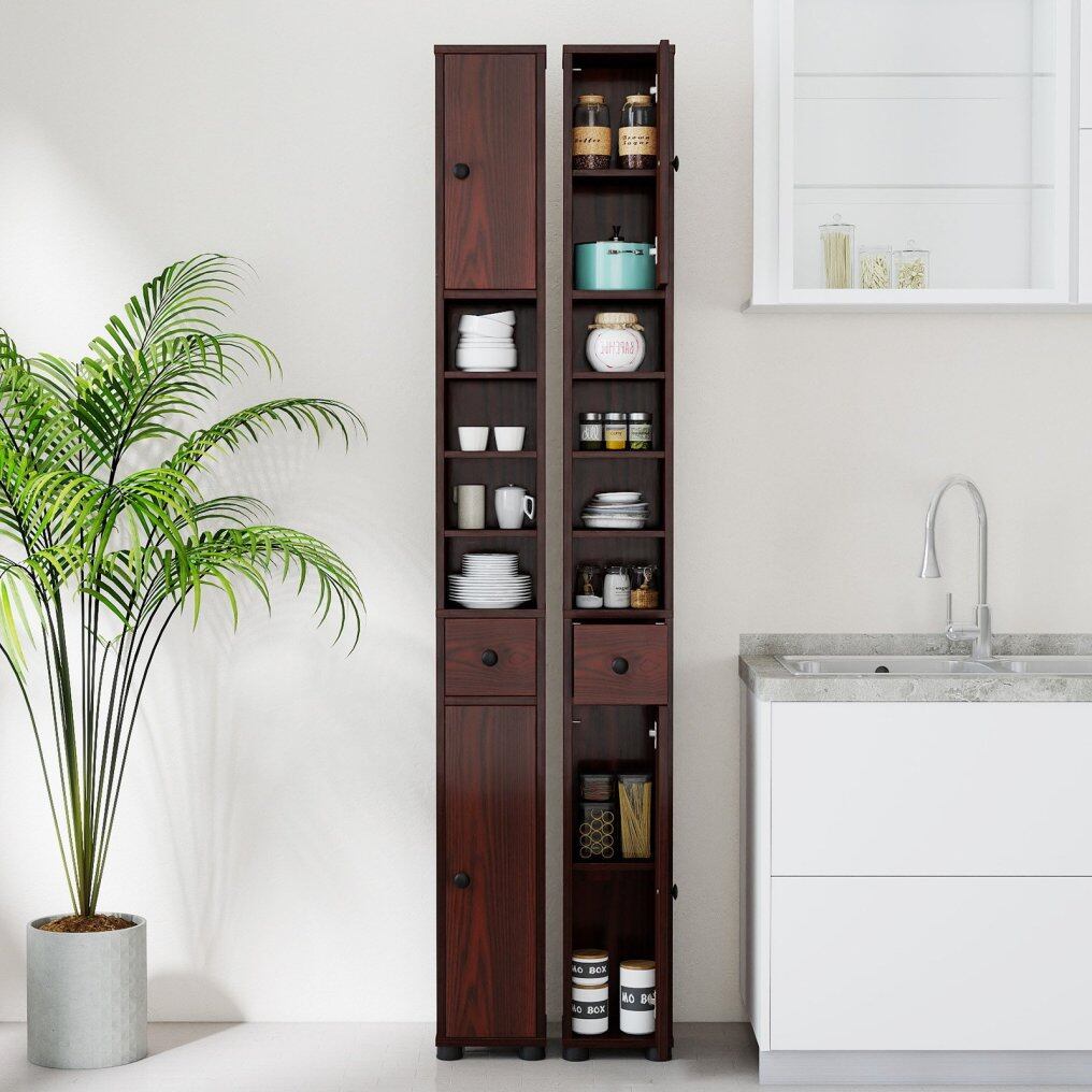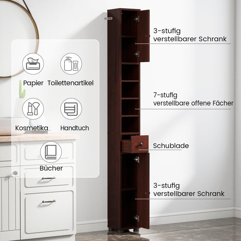 Closed cabinet & adjustable shelves: With two 3-way adjustable cabinets, a 7-way adjustable open shelf and a drawer, this narrow bathroom cabinet is perfect for storing towels, toiletries, books, cosmetics and toilet paper.