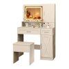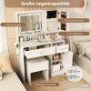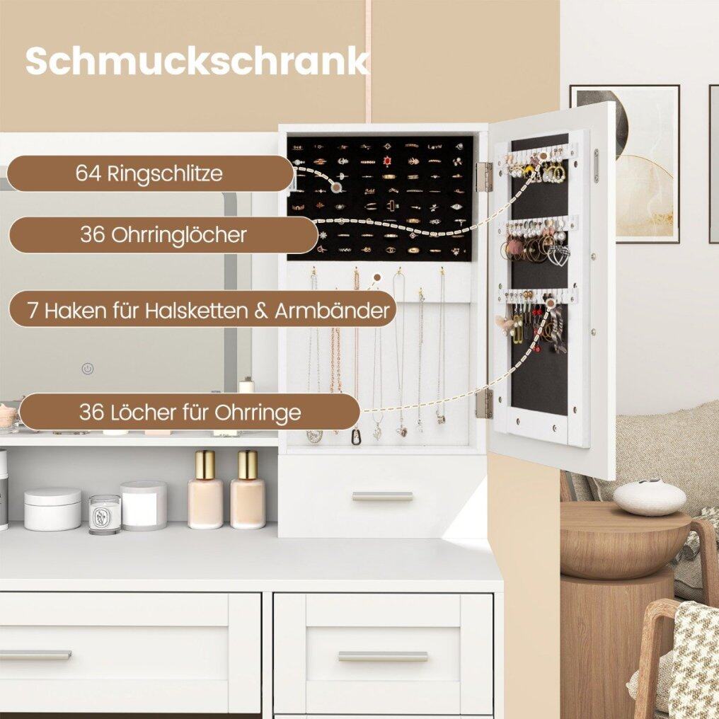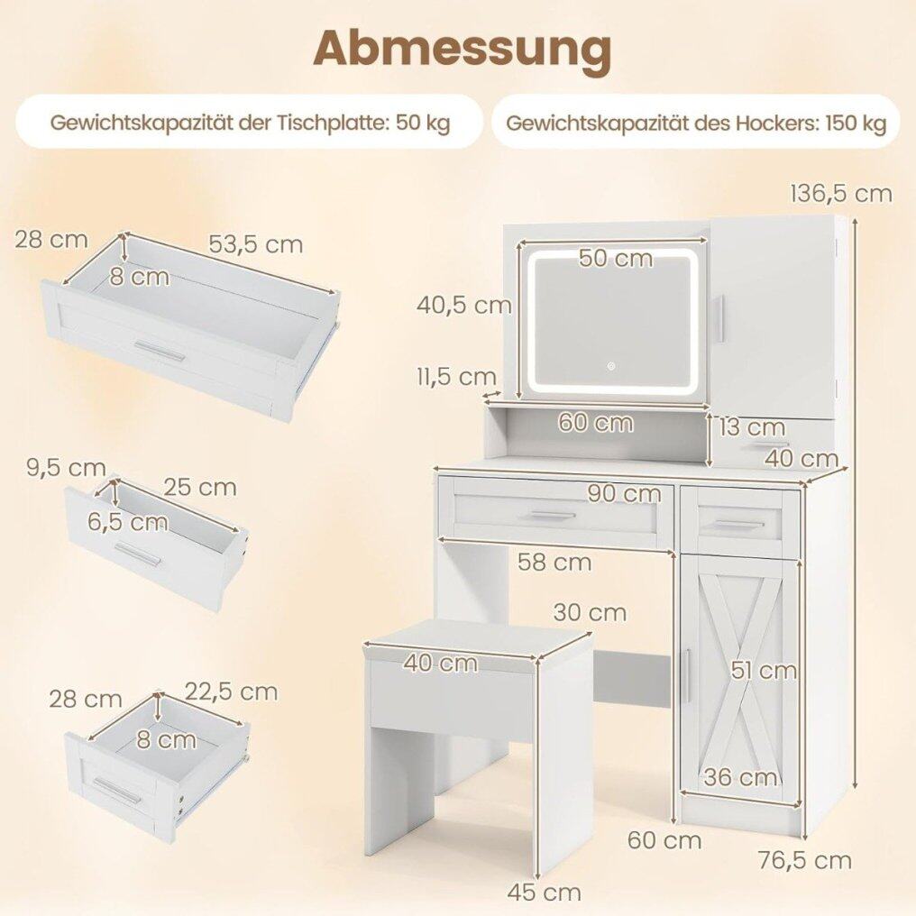 Large storage capacity: Your makeup area will always stay neat and tidy with a jewelry cabinet, another closed cabinet with a 3-level adjustable shelf, an open storage shelf, 3 drawers and a hairdryer stand. The dimensions of the dressing table are: 90 x 40 x 136.5 cm (L x W x H).