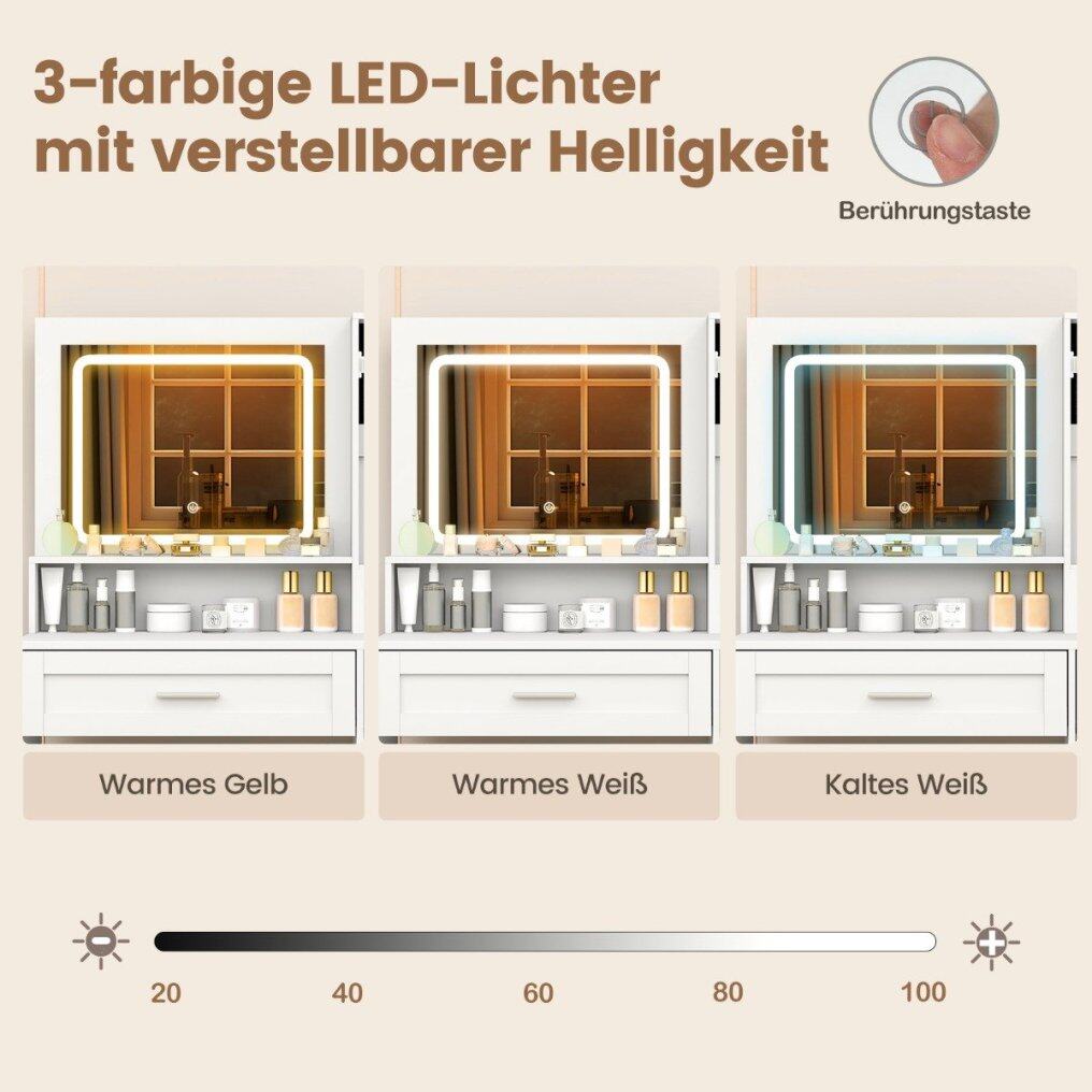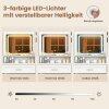 LED Illuminated Mirror: The illuminated mirror is equipped with 3-color LED lights with adjustable brightness (20%-100%) and a touch button, emitting warm yellow, warm white or cool white light as needed.