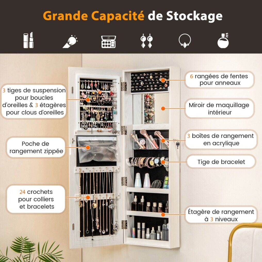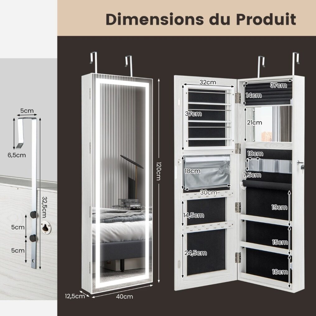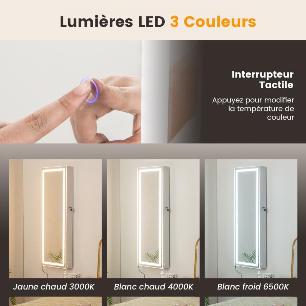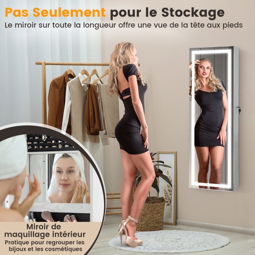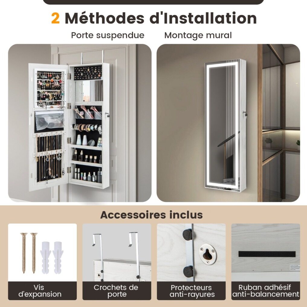 The full-length mirror offers a great view from head to toe and the LED lights are adjustable in 3 color temperatures (3000K warm yellow, 4000K warm white, 6500K cool white) and are easy to operate via the touch switch. The interior of this jewelry stand is divided into different storage compartments so that your jewelry and makeup can be kept well organized. This jewelry organizer is available for both door hanging and wall mounting and the necessary accessories are included in the package.