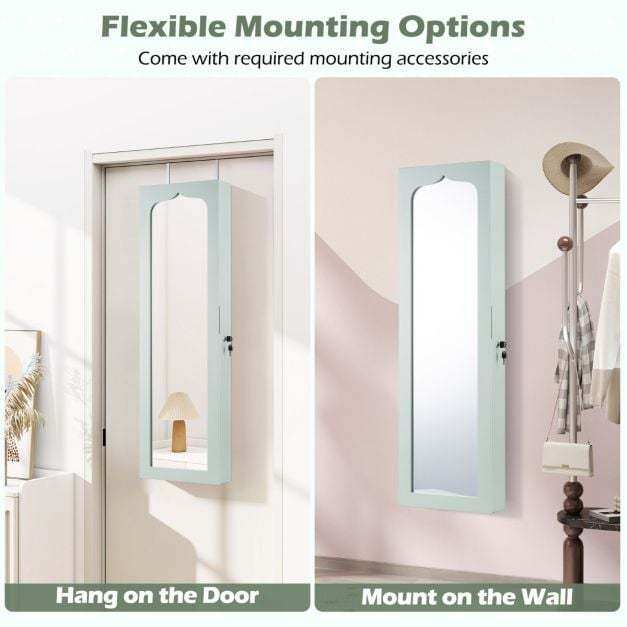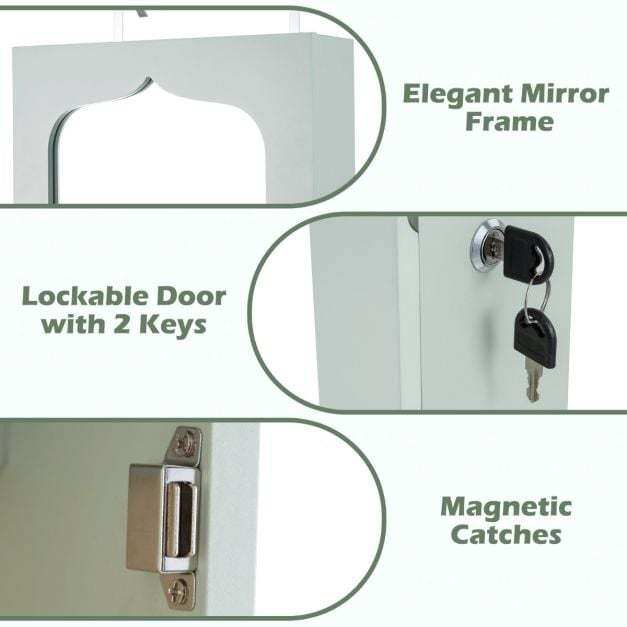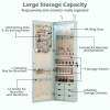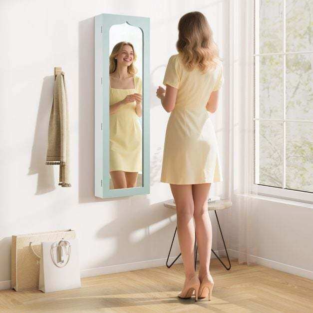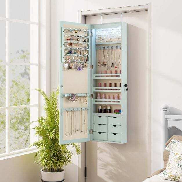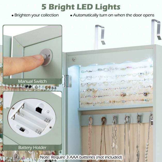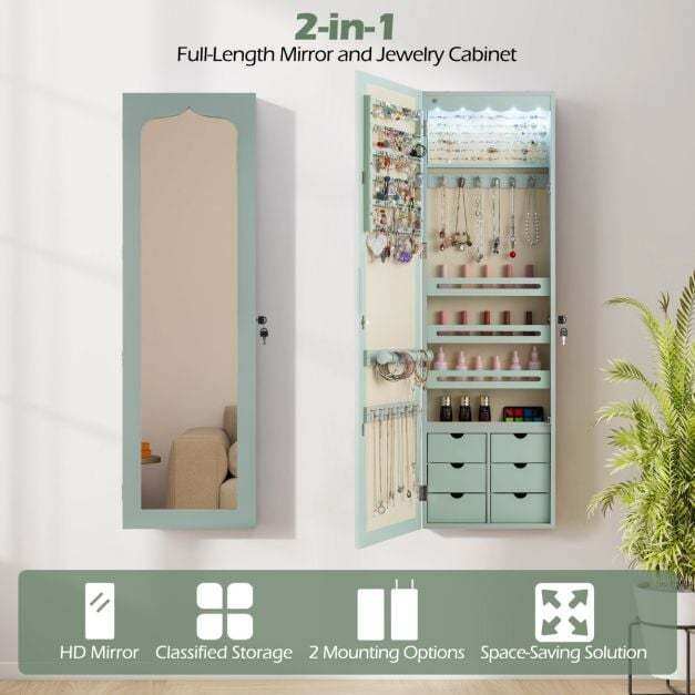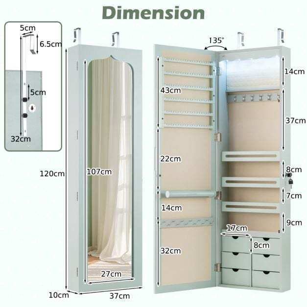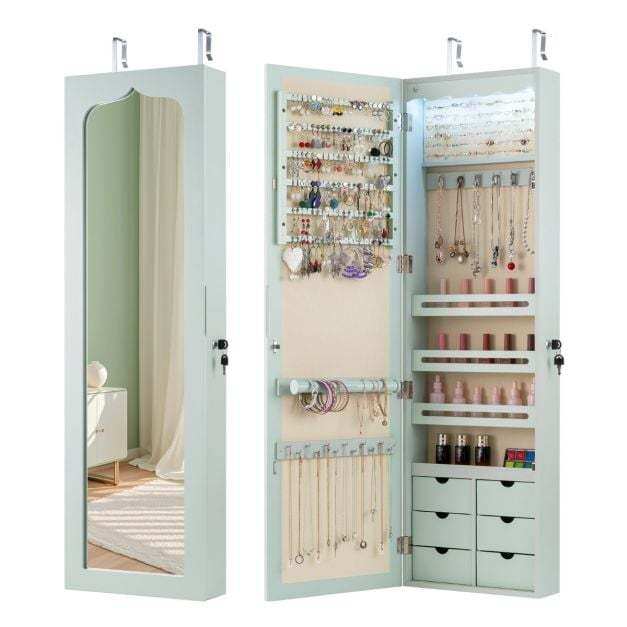 Made from high-quality MDF, this jewelry cabinet is extremely robust and durable. Thanks to the numerous compartments and integrated lock, you can store all your favorite accessories individually, safely, and neatly. You can hang the cabinet with hooks over the door or mount it to the wall with screws, which further saves space. Furthermore, the five automatic lights help you select the right jewelry, making it easier to find it even in the dark or to create a dynamic display. The full-length mirror gives you an excellent overview of your appearance and makes it easier to combine your jewelry with your outfit.