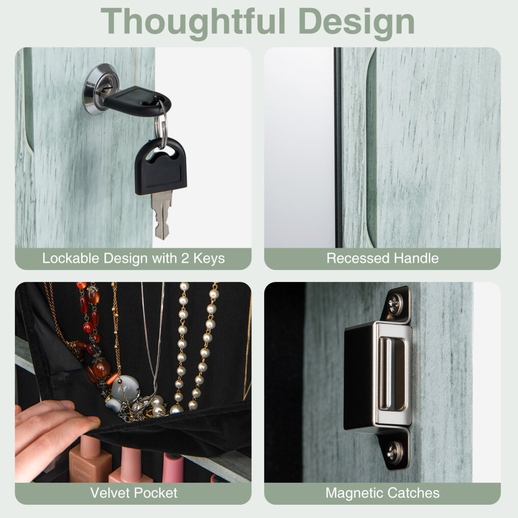 Practical : Jewelry cabinet and mirror two in one, lined with black velvet, protect your jewelry from scratches, with a foldable makeup board for easy placement of your cosmetics