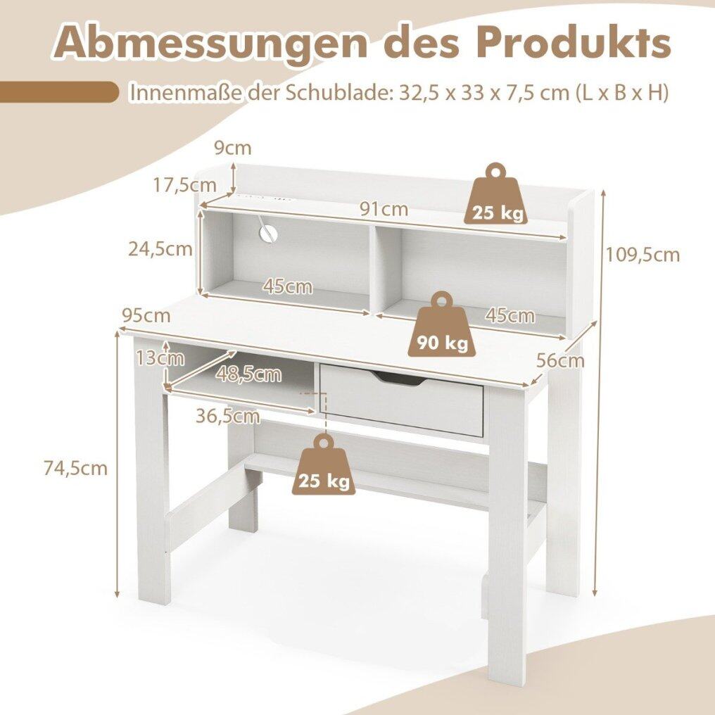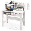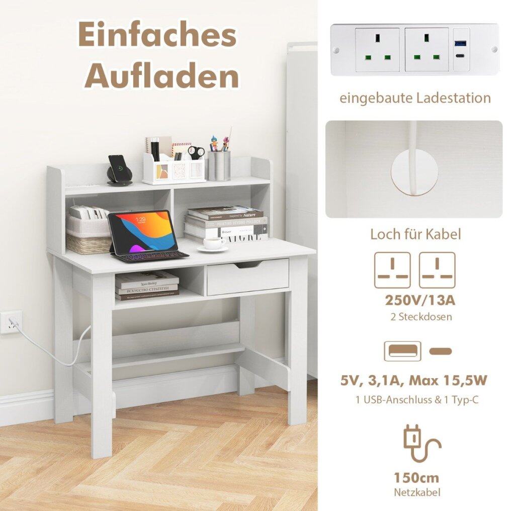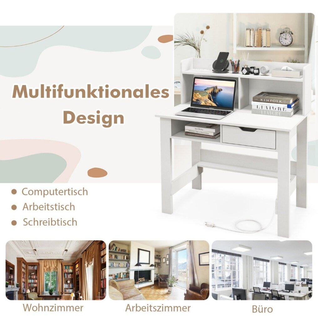 Transform your workspace with our computer desk designed to meet your study and work needs. The integrated charging station and cable management hole are elegantly embedded into the table, providing easy access to power for various electronic devices. The wide tabletop and open shelf increase the classification and display area for items. With an open compartment and a drawer, this desk provides ample storage space to keep your workspace neat and organized. Bring the computer desk to the home office and maximize your workspace perfectly.