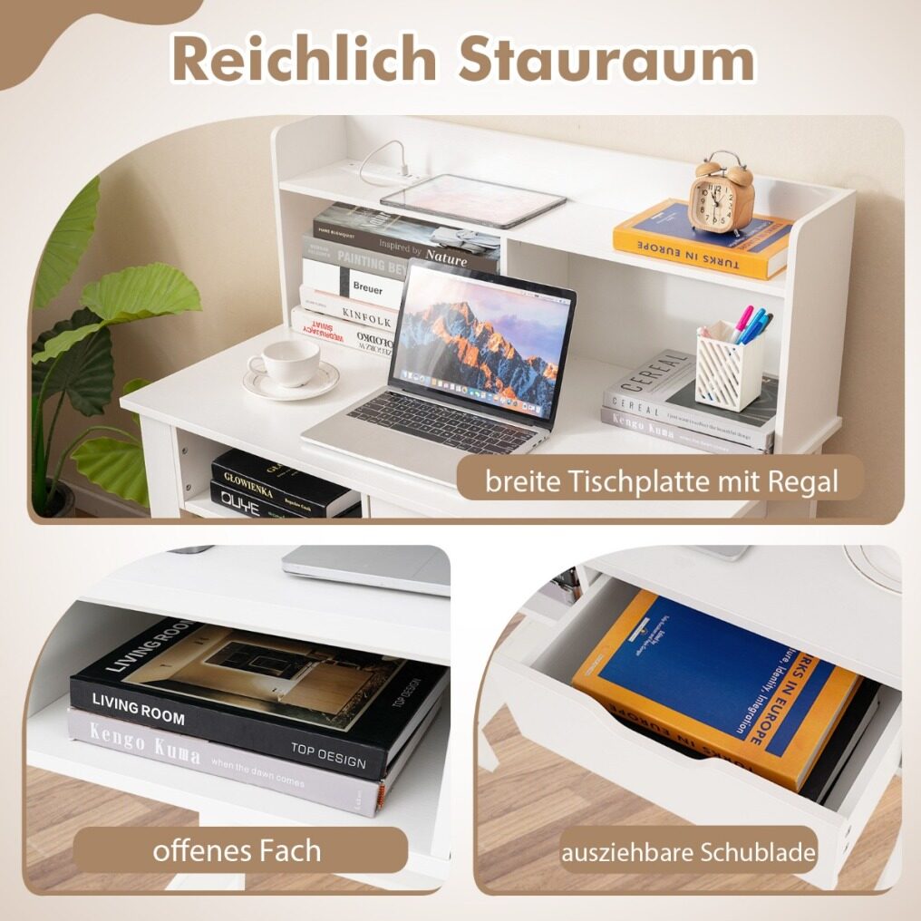 Wide table top with shelf: The table top makes it easy to place your laptop, lamp, books, etc. and keeps things organized. The attached open shelf increases the storage space without taking up the floor.
