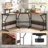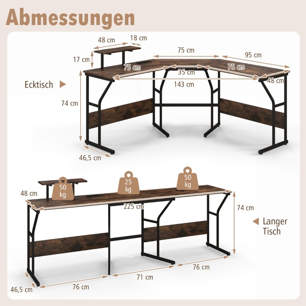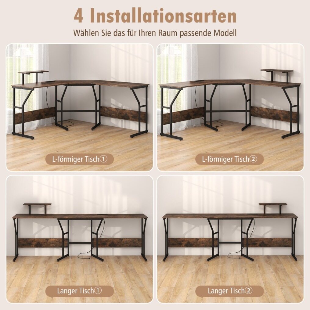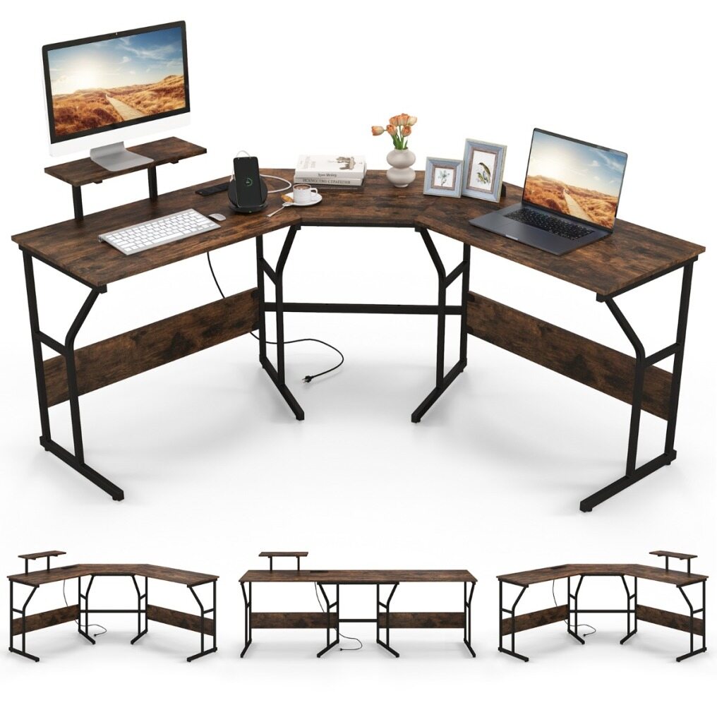 Discover the ultimate L-shaped computer desk that will revolutionize your work and play. It flexibly fits into any corner or extends to create a spacious 88.5" double desk perfect for collaboration! Say goodbye to neck pain with its detachable monitor stand for the ideal viewing height. Enjoy clutter-free power access right where you need it with an integrated power strip with USB ports. Rely on its sturdy metal frame to easily hold all your heavy tech. Whether for intense gaming sessions, productive office days, or creative endeavors, this corner desk adapts to all and enhances your space with elegance and efficiency. Don't hesitate! Upgrade to a smarter workspace today!