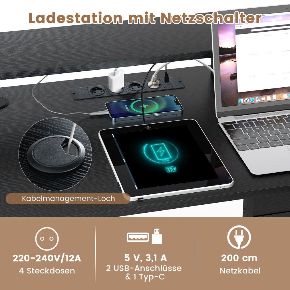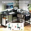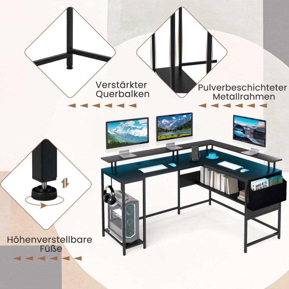 Bright RGB LED strips provide captivating lighting. The integrated charging station with an on/off switch powers all your devices, and the L-shaped desktop offers plenty of space for multiple monitors. The under-desk storage compartment keeps books or gaming accessories neatly organized. The CPU holder keeps your computer tower off the floor, and the included fabric bag and metal hooks offer additional storage space for accessories. The foldable monitor stand raises the screen to an ergonomic height. This L-shaped computer desk is constructed from a sturdy metal frame, making it particularly durable. This L-shaped desk fits perfectly in any corner and efficiently utilizes the space in your home office.