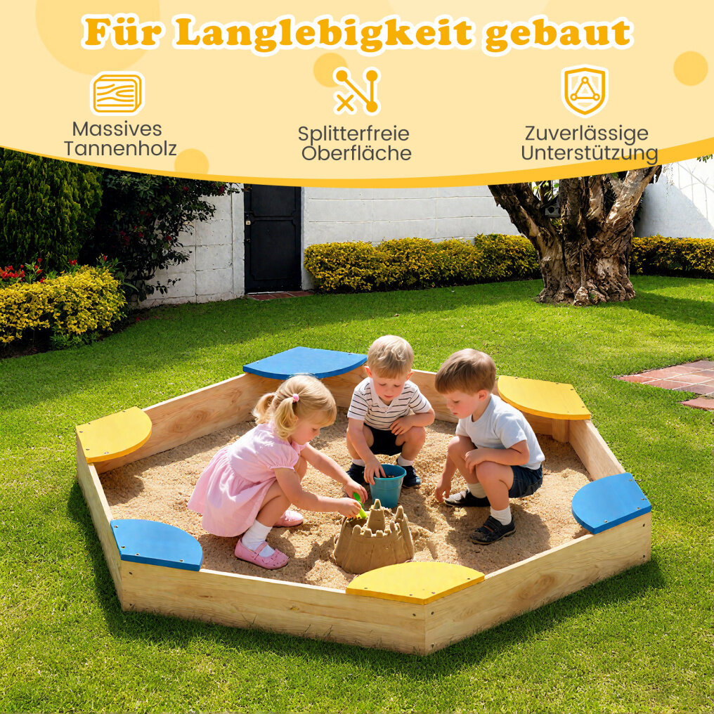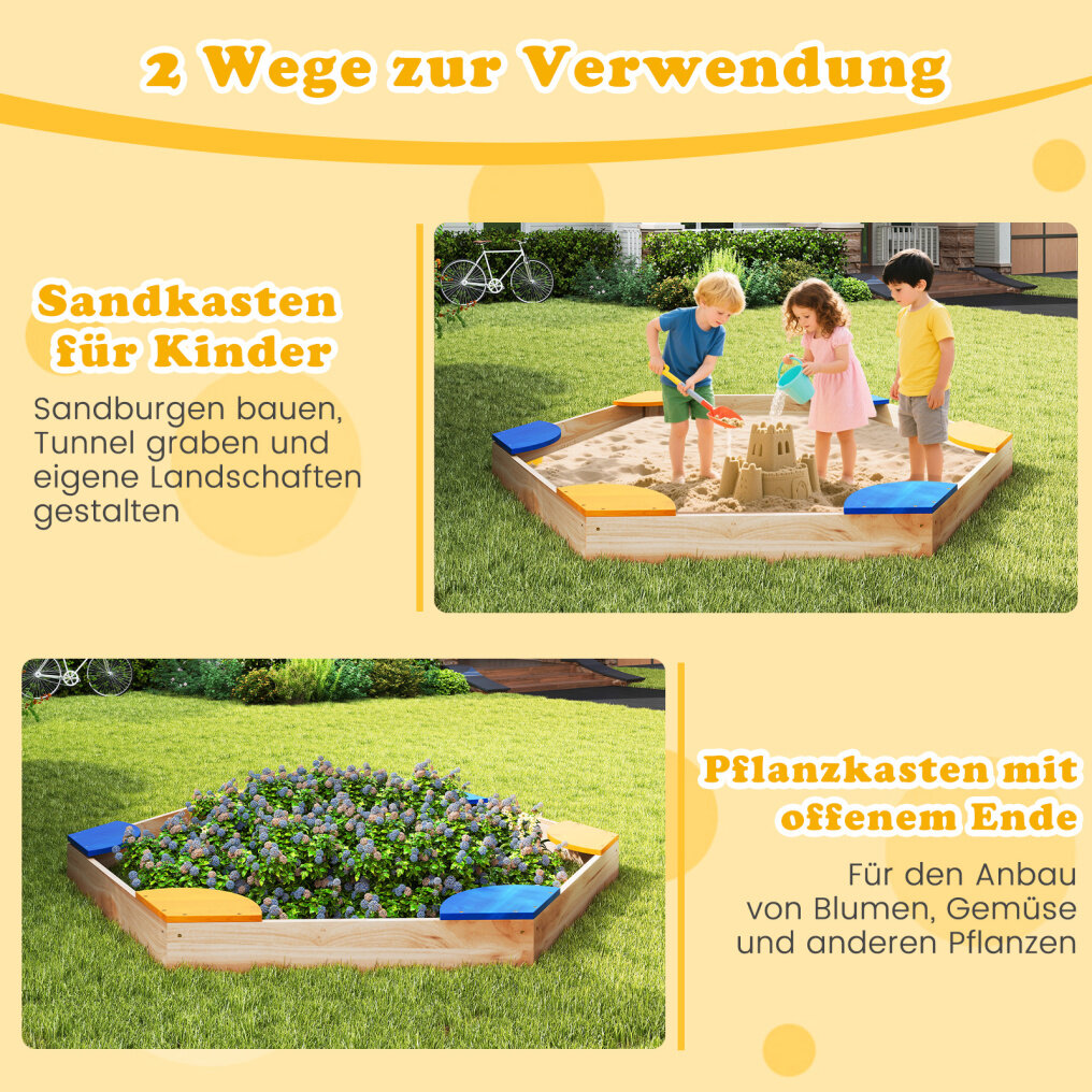 Transform your garden into an adventure paradise with our hexagonal wooden sandbox! Made from sturdy spruce and fitted with stainless steel screws for durability, this versatile piece of furniture isn't just a sandbox; it also transforms into an open planter. Ideal for planting flowers and vegetables, or for children to play in! With its generous size and comfortable, child-friendly seats, each supporting up to 30 kg, it provides the perfect place for children to relax and play. Suitable for children aged 3 and up, this is more than just a sandbox; it's a launching pad for creativity and joy. Get yours now and give your children endless outdoor fun!
