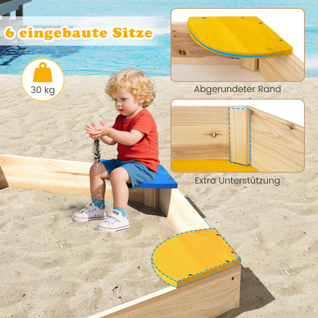 Comfortable seating: There are 6 sector-shaped seats with rounded edges and additional support, making this large sandbox a cozy meeting place. Each seat can hold up to 30 kg, so children can relax and play safely.