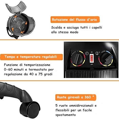 Features: The hooded hair dryer has several functions including: heating, drying and hair care.