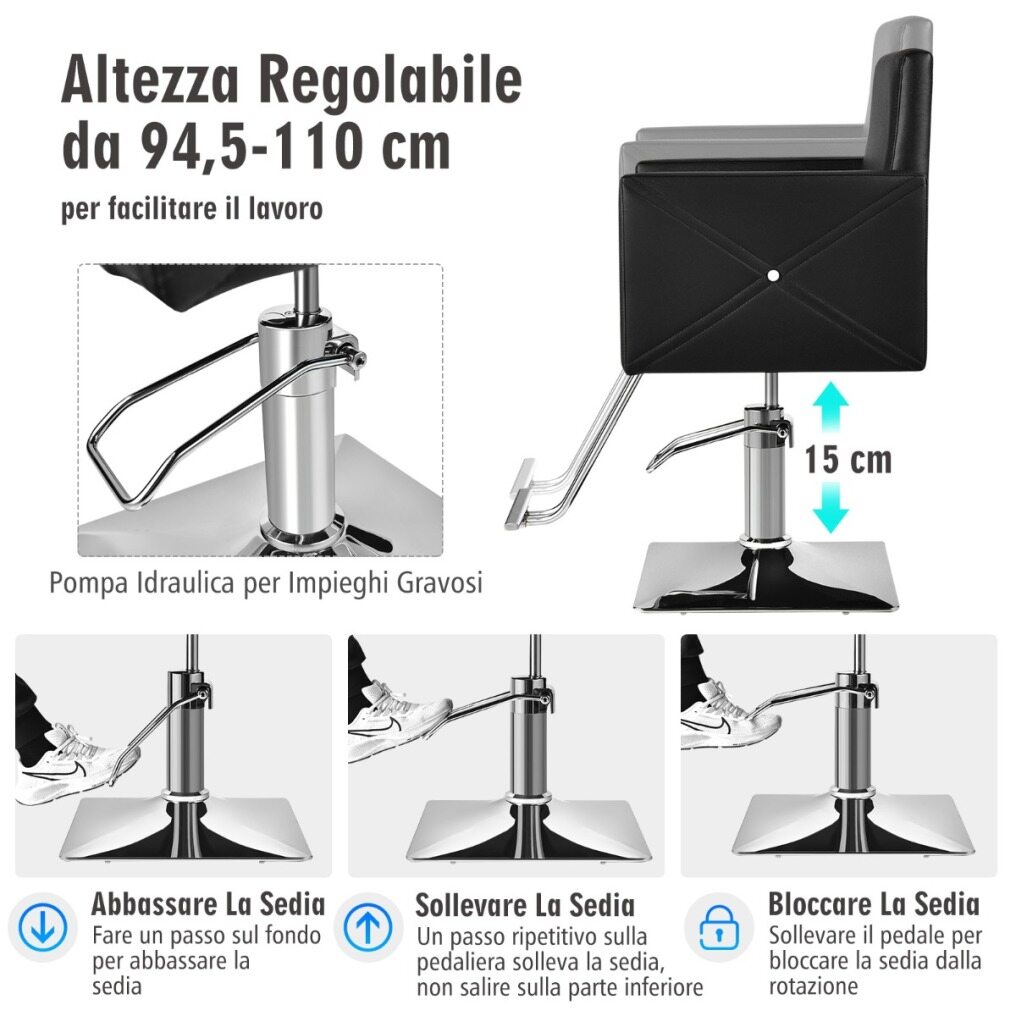 Adjustable Height: The makeup and salon chair features a heavy-duty hydraulic pump, allowing you to easily adjust the height from 94.5 to 110 cm. Simply press the pedal to lower the chair and repeat to raise it, adapting to different client heights.