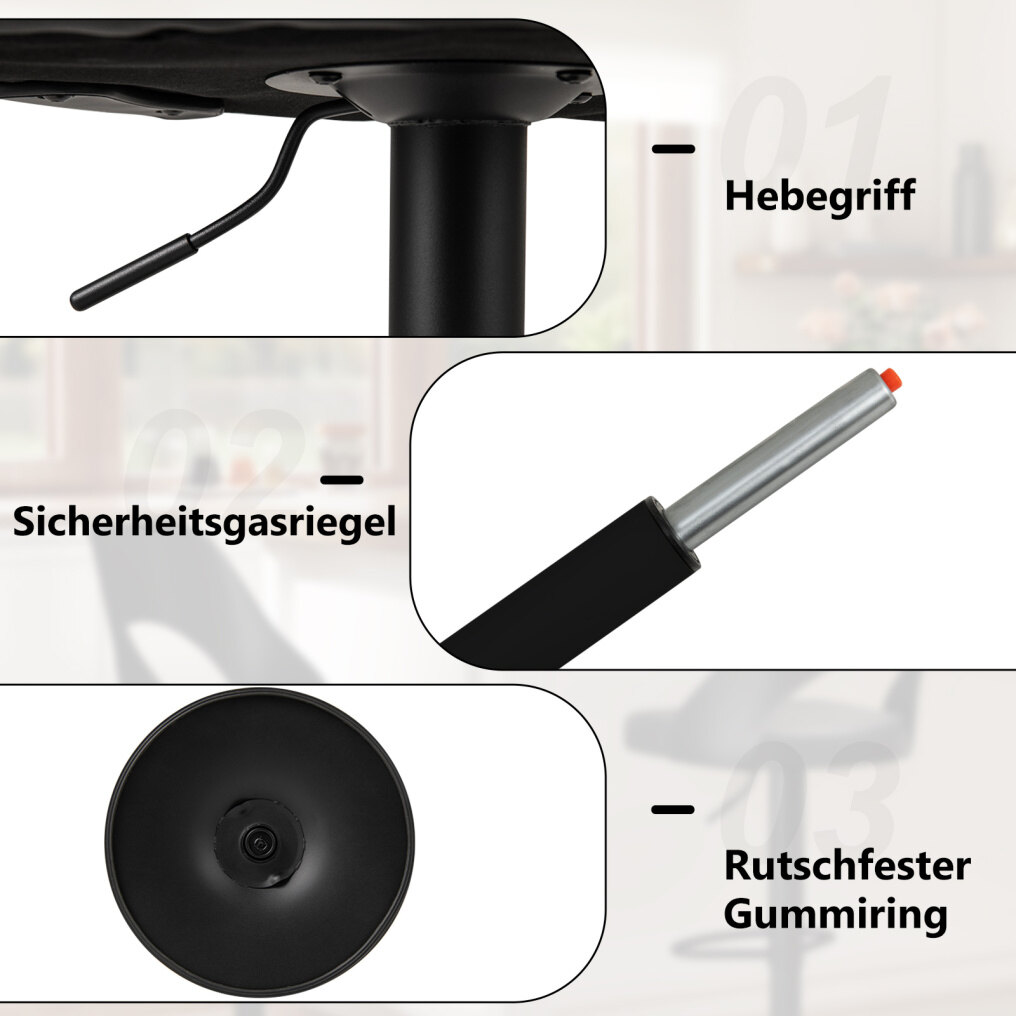 Sturdy and Safe Construction: The bar chair features a secure gas lift for smooth height adjustments and a lift handle for ease of use. It also has a non-slip rubber ring at the base to prevent slipping and scratching your floor while ensuring the stool stays firmly in place.