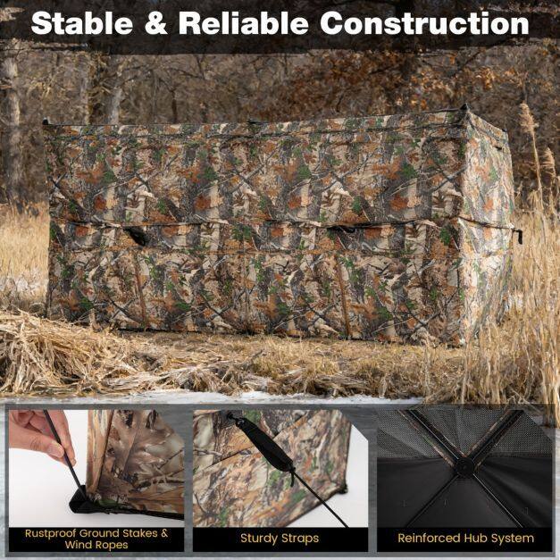 ● Stable & Reliable Structure: Built with high strength oxford fabric and reinforced with rustproof fiberglass poles, the hunting blind is tough enough to handle hunting environments. Additionally, electrophoretic ground stakes and sturdy wind ropes ensure a reliable hold for added stability.