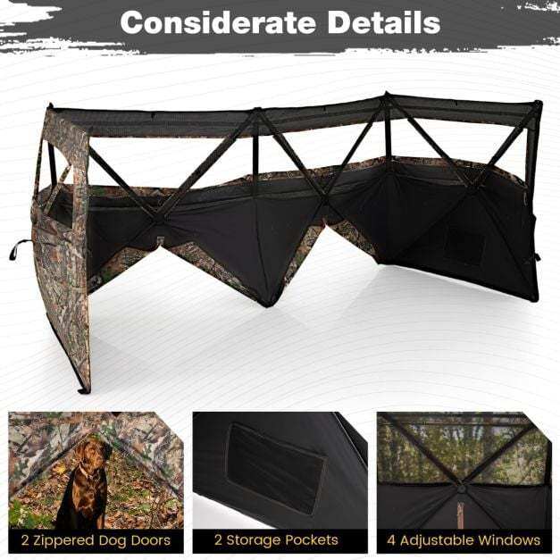 ● Enhanced Hunter-Focused Features: Tailored for maximum stealth, the waterfowl duck hunting tent includes 2 zippered dog doors, 4 silent-sliding windows, storage pockets, authentic camouflage pattern and brush-in loops, making it an exceptional base for hunters and their canine companions in outdoor scenarios.