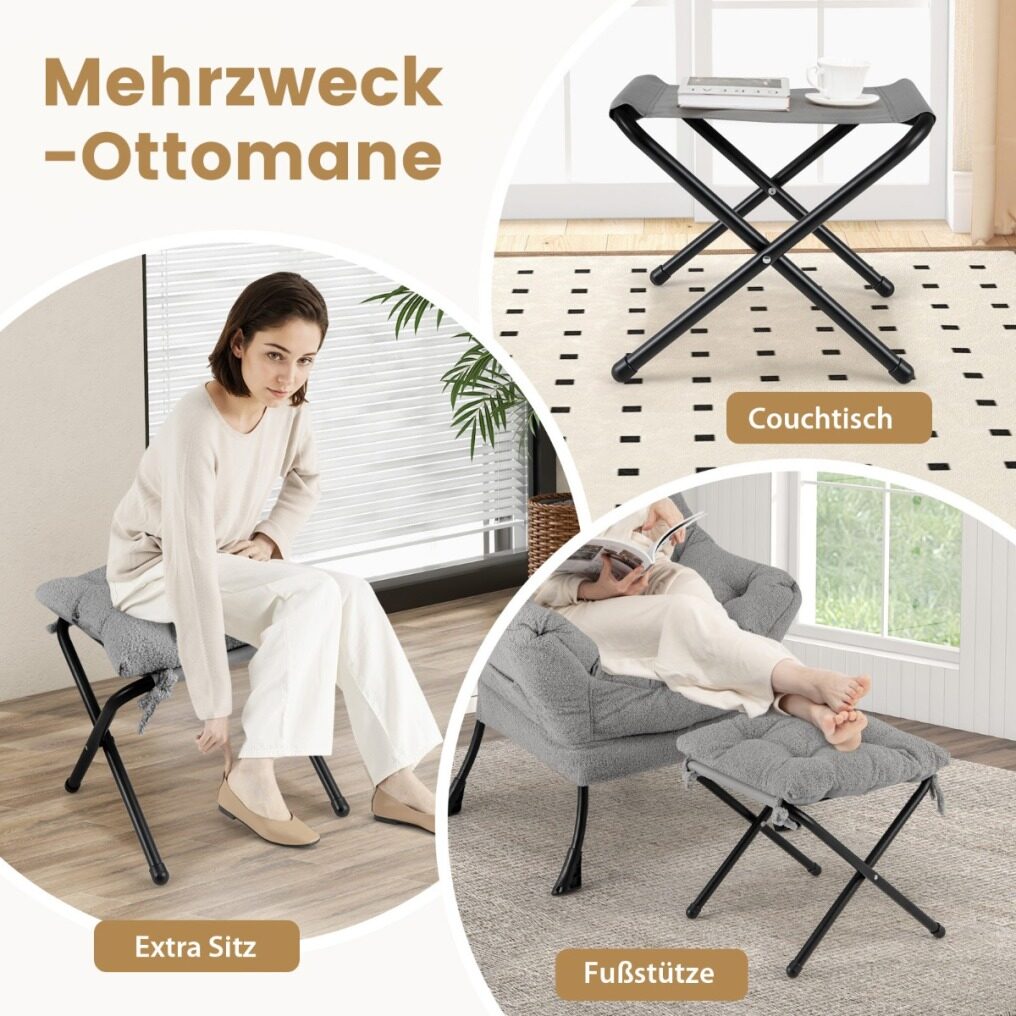 ● Multipurpose Ottoman: This accent chair comes with an ottoman that can be used as a coffee table, extra seat, or footrest. When not in use, it can be easily folded up into an X-shaped structure. Additionally, the cushion on the footrest can be removed with robust fixing ties.