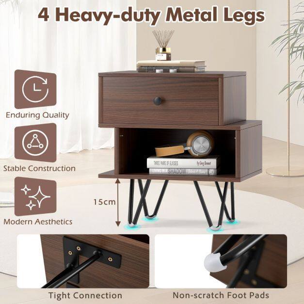 Heavy-duty Metal Legs: The bedside tables are supported by sturdy metal legs, ensuring stability and reliability against wobbling. And the legs are fitted with protective foot pads to prevent scratches, while the 15 cm off-ground clearance facilitates easy cleaning underneath.