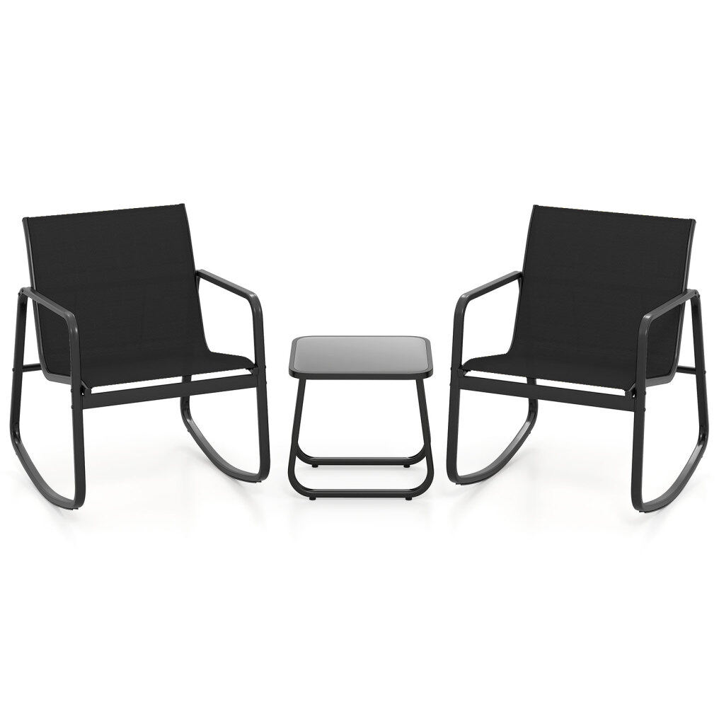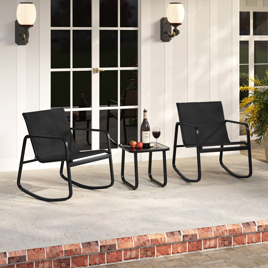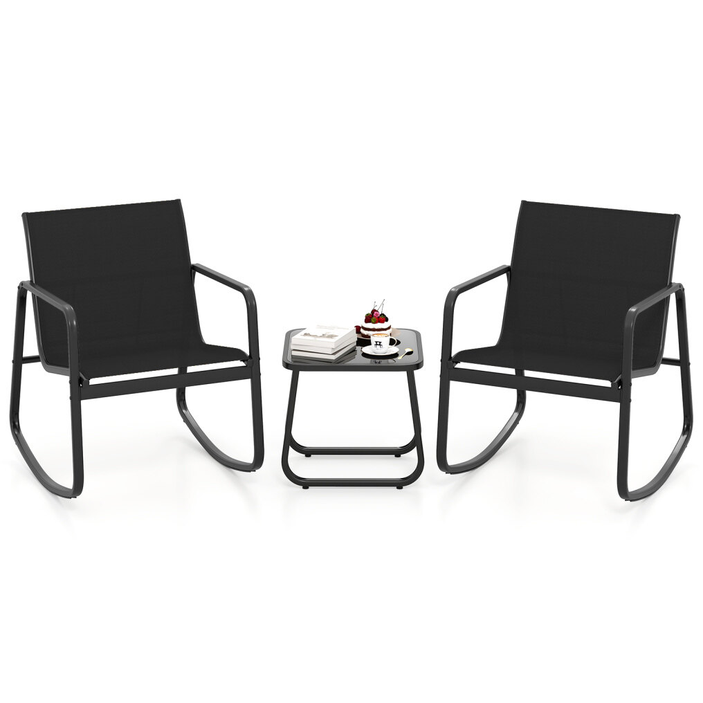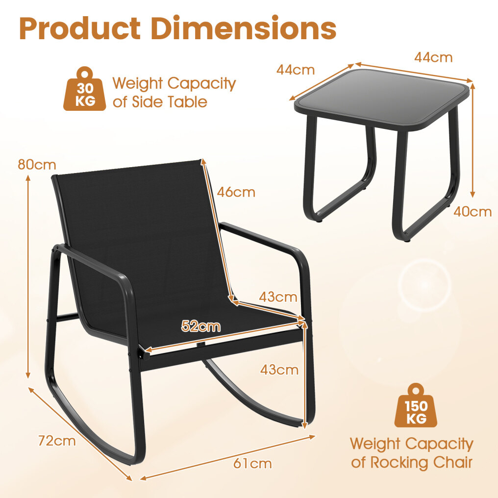 This patio set includes a table and 2 rocking chairs that provide a gentle rocking motion, thanks to the stable base with non-slip rubber pads and adjustable stoppers. The ergonomic seat with quick-drying fabric will provide you with ultimate comfort. Made with a solid metal frame, the set provides reliable support and is rust-resistant, and the elegant tempered glass top is firmly fixed by 4 suction cups. Whether in your backyard or on your balcony, it promises a safe and sturdy option for outdoor relaxation.