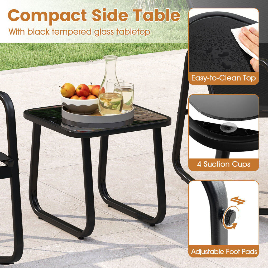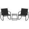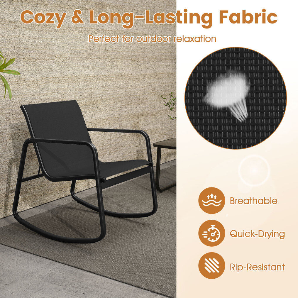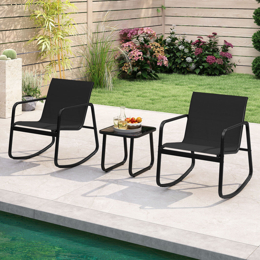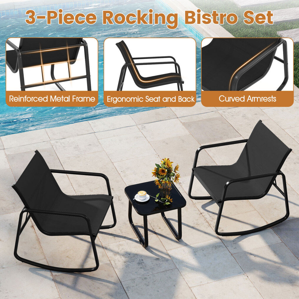 This patio set includes a table and 2 rocking chairs that provide a gentle rocking motion, thanks to the stable base with non-slip rubber pads and adjustable stoppers. The ergonomic seat with quick-drying fabric will provide you with ultimate comfort. Made with a solid metal frame, the set provides reliable support and is rust-resistant, and the elegant tempered glass top is firmly fixed by 4 suction cups. Whether in your backyard or on your balcony, it promises a safe and sturdy option for outdoor relaxation.