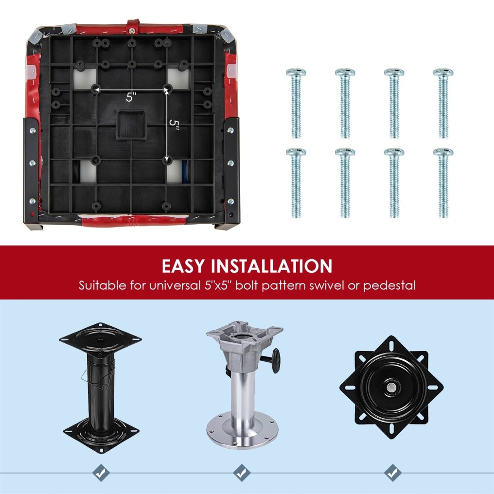 ● Simple Installation Steps Required: Included with stainless steel screws, this yacht seat can be simply assembled on the stand (not included) by following the detailed instruction. And the chair fits standard 5" x 5" mounting bolt pattern, any standard 4-bolt swivel or pedestal will be fine. If you have any questions, please feel free to contact us.