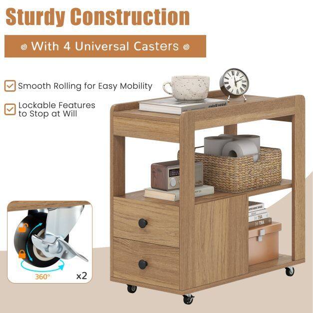Revolutionize your space with our sleek, lockable end table on wheels! Maximize storage with this stylish 3-tier, 2-drawer table, designed to glide effortlessly into tight corners or alongside your sofa. Lock it in place for a sturdy, spill-free setup. This piece isn’t just functional - its strong build and easy-clean finish ensure enduring beauty, making it a smart addition to any busy home. With raised edges and round corners, it’s as safe as it is chic. Perfect for small spaces but spacious enough for all your essentials—upgrade your living room, bedroom, or office today with this must-have mobile solution!