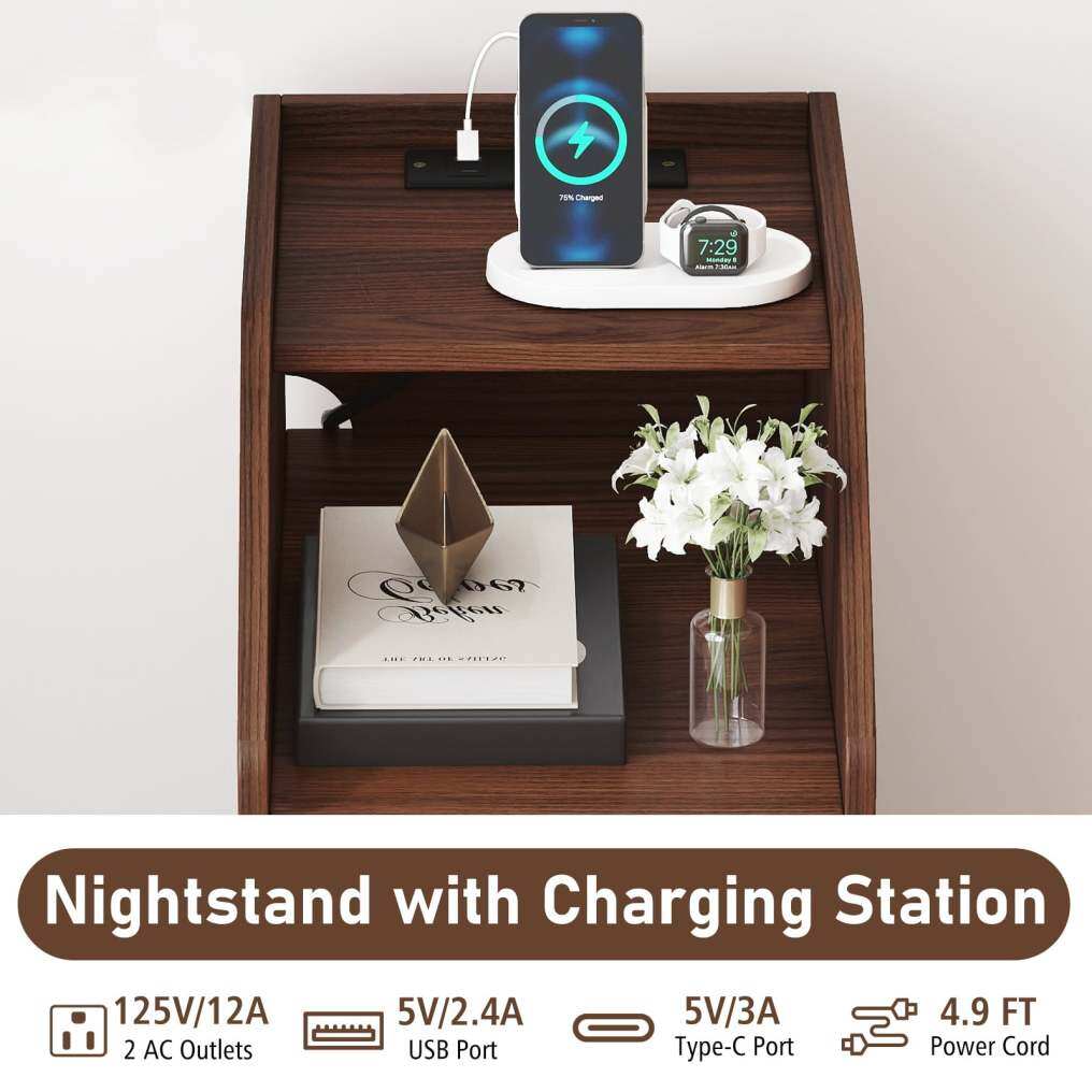 Integrated Charging Station: Enjoy the convenience of built-in charging, featuring 2 AC outlets, a USB port, and a type-C port to power your devices at your fingertips. The side table includes a 4.9 ft long power cord for easy access to wall outlets.