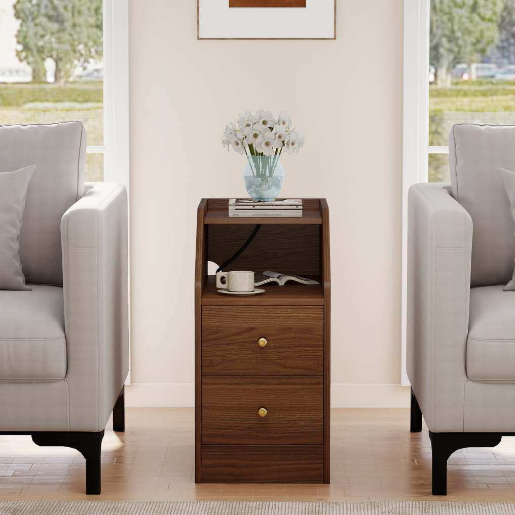 Perfect Storage System: Designed for organization, this end table boasts a wide top surface, a spacious open compartment, and 2 easy-glide drawers. The smart cable hole at the back helps you keep cords neatly managed and hidden.