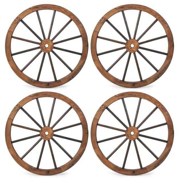 Looking to infuse a touch of nostalgia into your living space? Our vintage decorative wheels are the perfect choice for those seeking to break away from the mundane. Crafted from natural fir wood and accented with iron, the hanging wheel decor is crack-resistant and non-deformable for lasting use. Additionally, the retro wooden wheel is carbonized to withstand outdoor elements. Besides, it remains exquisite wood grain that is sure to captivate your guests. Whether you're looking to spruce up your bedroom, dining room, pub, garden, or patio, our vintage decorative wheels are versatile enough to complement any setting. You can use the 4 pack wagon wheel as a unique wall ornament, a stylish table centerpiece or even a creative outdoor accent piece.