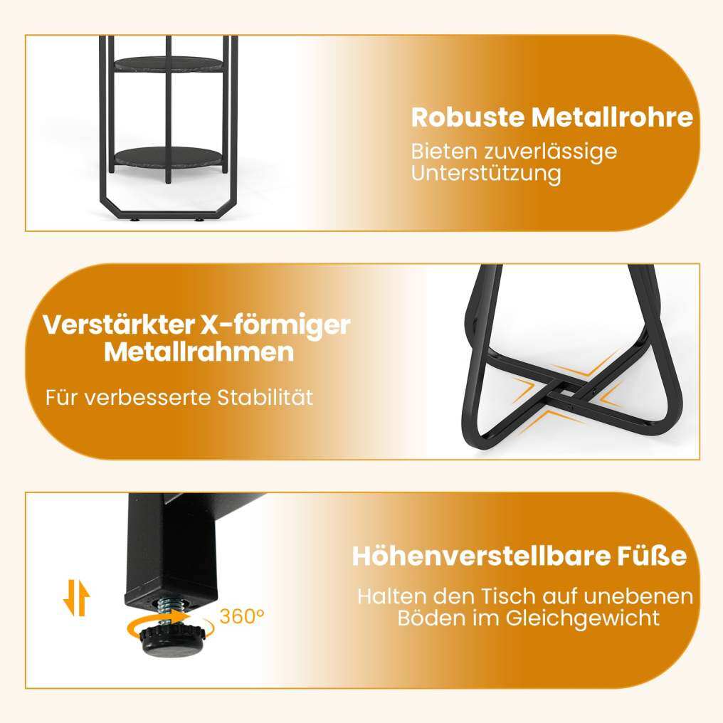 Our 3-piece table and chair set features a sturdy metal frame and reinforced X-shaped structure, providing reliable stability and easily withstanding daily use. The rectangular table has integrated two-tiered shelves on the sides, ideal for keeping essentials within easy reach and your space organized. With its space-saving design, the stools can be neatly tucked under the table – the perfect solution for apartments, small kitchens, or breakfast nooks.