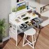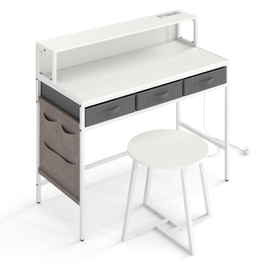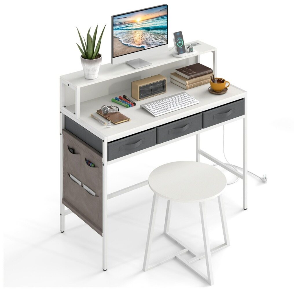 Elevate your workspace with this ergonomic desk and stool set! This work table features a built-in monitor stand that raises your screen to eye level for greater comfort and reduced neck strain. The spacious work surface is complemented by three fabric pull-out drawers and convenient side pockets, providing plenty of organized storage within easy reach. The built-in charging station features two AC outlets, a USB port, and a Type-C port for easy access to power your laptop, phone, and other electronic devices.