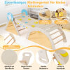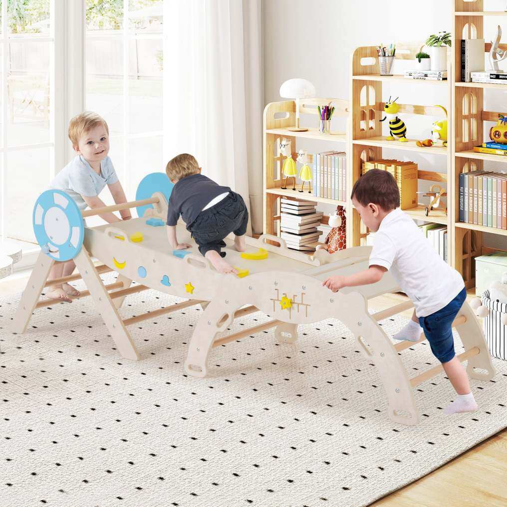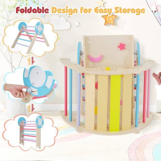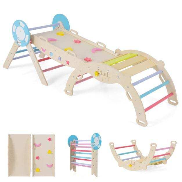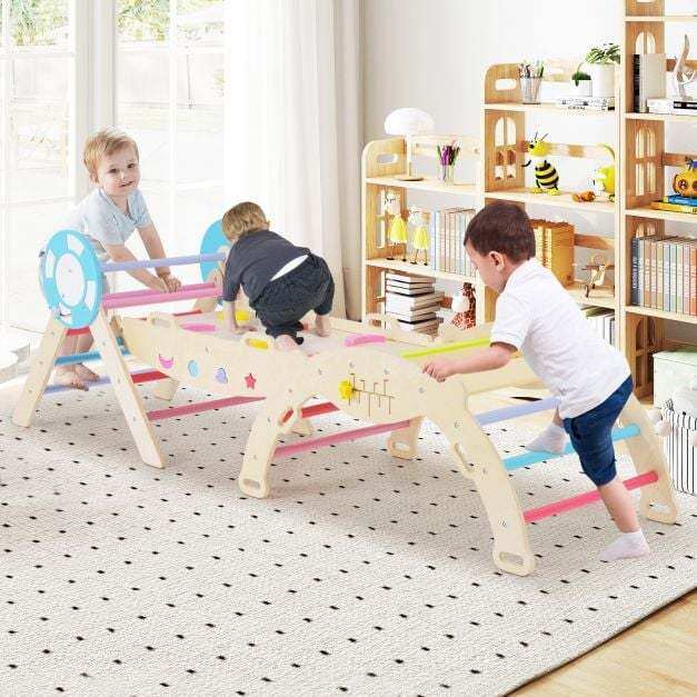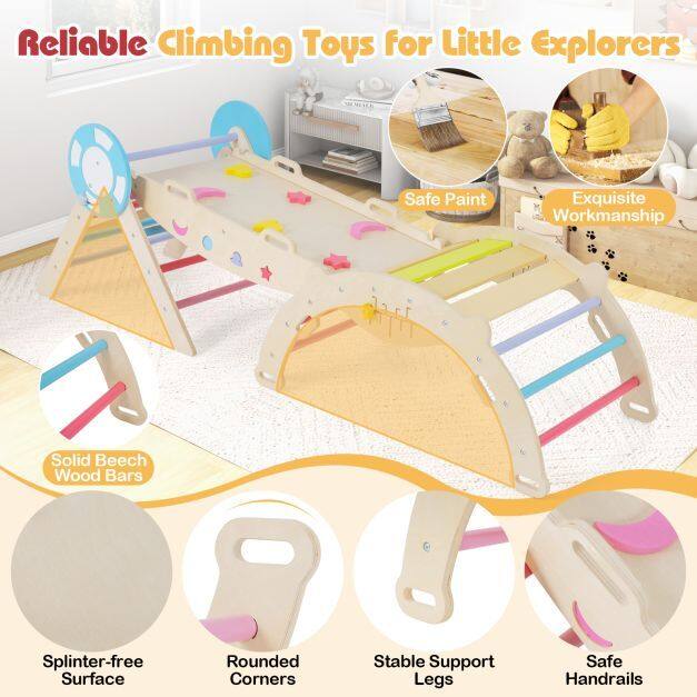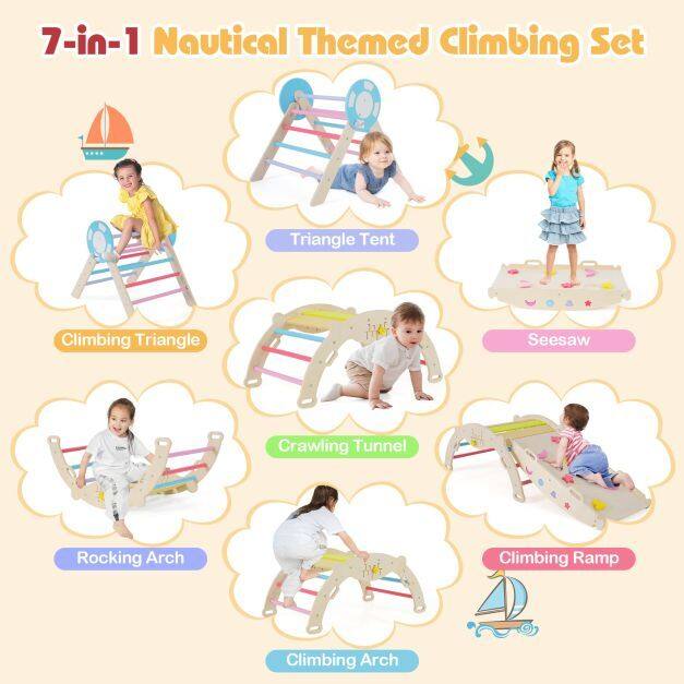 Creative 7-in-1 Setup: This toddler climbing set includes a triangular ladder, ramp, and arch that can be used individually or combined freely. Children can balance on the seesaw, climb the ramp, hide in the cozy triangular tent, explore the climbing triangle, arch over the climbing arch, swing on the arch, and crawl through the tunnel.