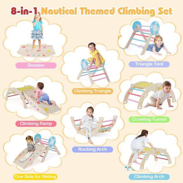 Creative 8-in-1 Setup: This toddler climbing set includes a triangular ladder, ramp, and arch that can be used individually or combined freely. Children can balance on the seesaw, climb the ramp, slide down the slide, hide in the cozy triangular tent, explore the climbing triangle, crawl over the climbing arch, swing on the arch, and crawl through the tunnel.