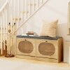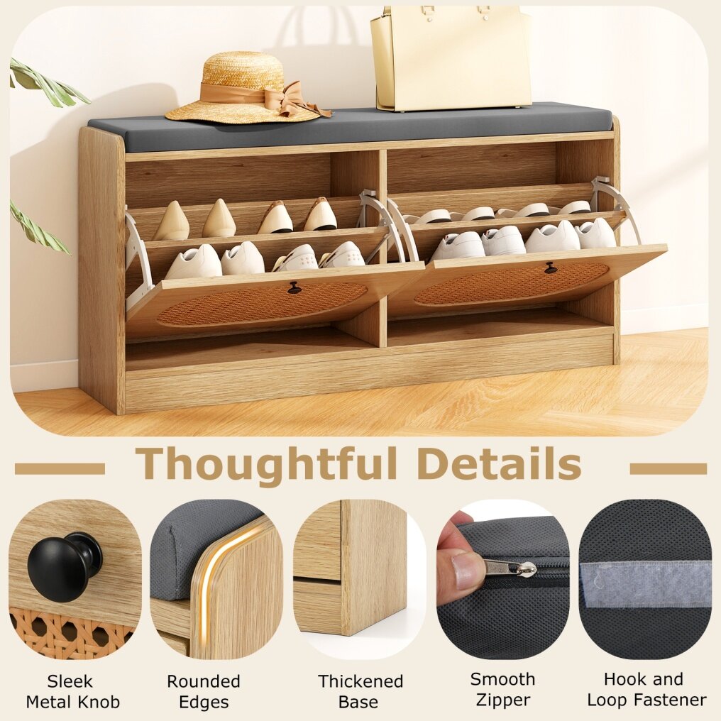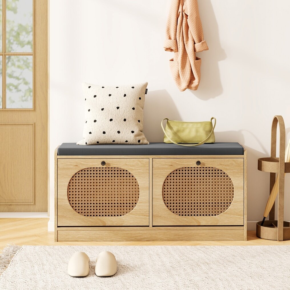 This shoe rack bench is equipped with two flip-over doors that reveal a spacious storage area, allowing you to customize the space according to your needs. Whether you want to store boots, sneakers, or sandals, the adjustable shelves make it easy to accommodate various types of footwear. Additionally, the rattan detailing on the doors combine practical storage with an elegant design. Upholstered with a sponge-padded cushion, this entryway bench offers a comfortable place to sit while you put on or take off your shoes. Notably, the boho shoe cabinet organizer seamlessly fits into a range of home styles.