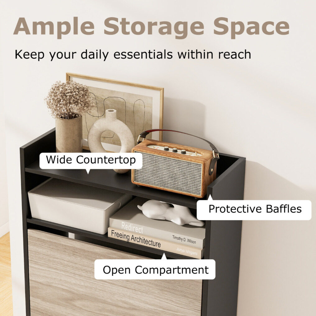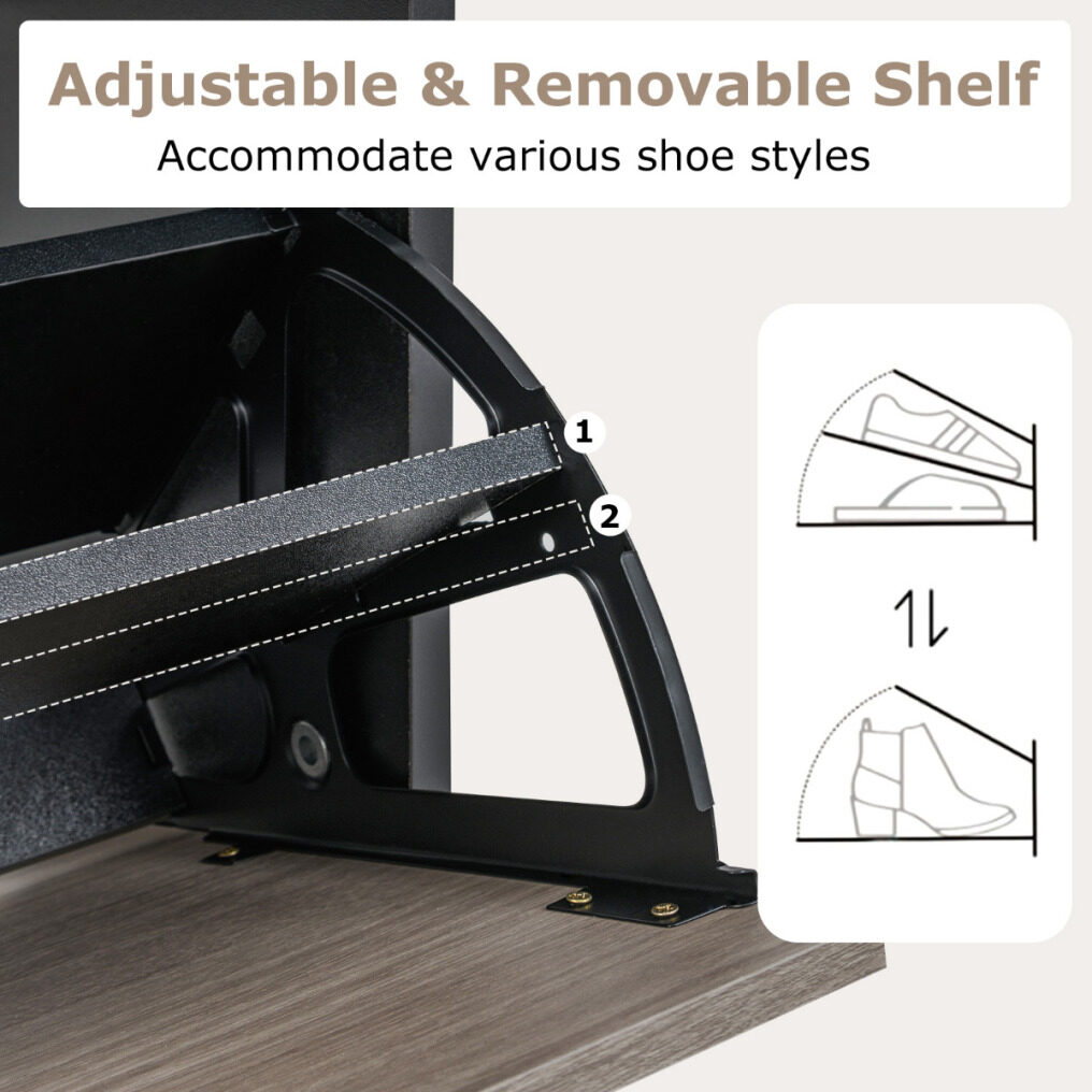 Versatile Storage Options: Featuring 2 flip drawers with adjustable and removable shelves, this shoe rack is designed for flexibility and accessibility. Plus, the wide countertop and open compartment provide extra storage space.