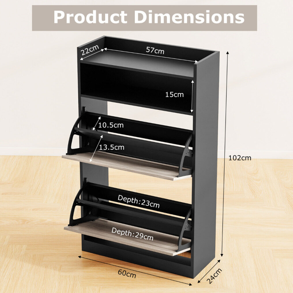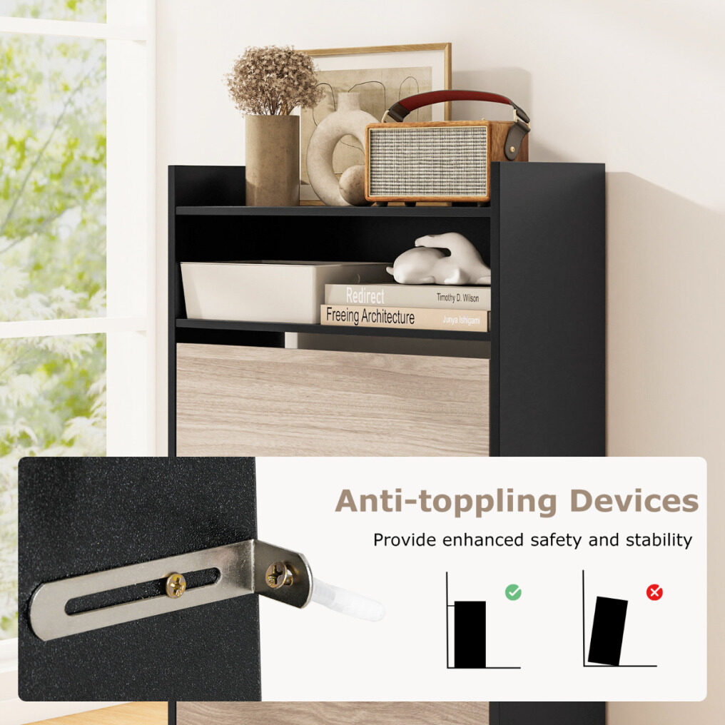 This shoe holder secures with anti-toppling devices and features a robust, thick base with anti-slip pads for unmatched stability. In addition, this slim shoe cabinet also offers a sleek, space-saving design measuring 60 x 24 x 102 cm to maximize vertical space. Its practical design includes top protective baffles and drawer stoppers, ensuring a user-friendly experience. The wide countertop, an open compartment and 2 flip drawers with adjustable and removable shelves transform clutter into a well-organized collection, fitting seamlessly into your entryway, foyer, hallway or living room.