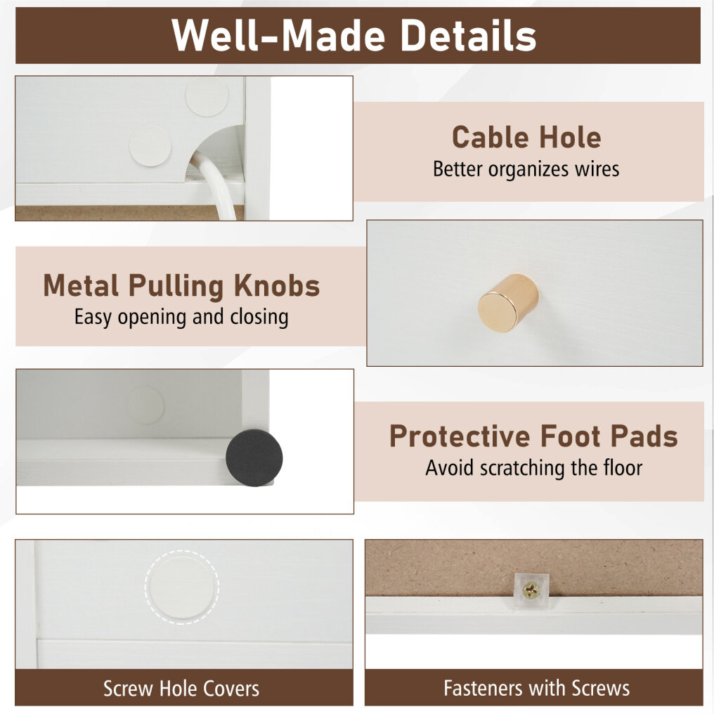 ● Effortless Maintenance: The inclusion of screw hole covers ensures the bedside table remains polished and refined. Designed for daily living, its smooth surfaces make cleaning convenient and allow you to maintain a pristine appearance with ease.