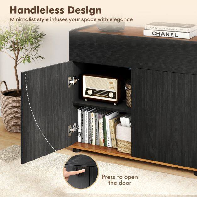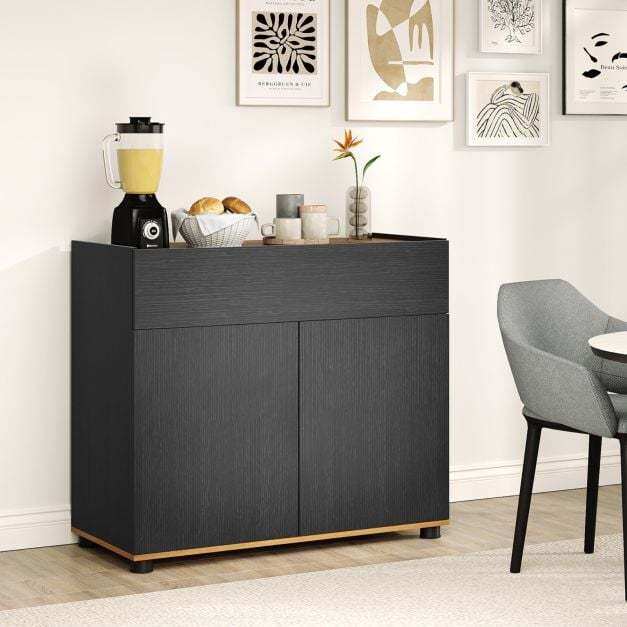 Organize more and reduce stress with our modern country-style sideboard! This freestanding storage unit combines elegant design with practical storage solutions, making it the perfect addition to your kitchen, dining room, or living space. Featuring a handle-free push-to-open mechanism, this coffee bar station boasts a sleek, minimalist look. The top, drawer, and two-door cabinet keep your essentials neatly organized.