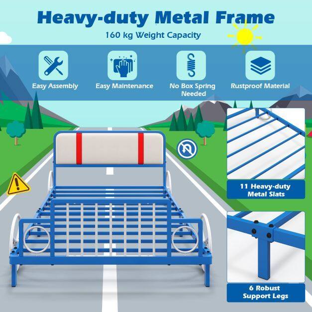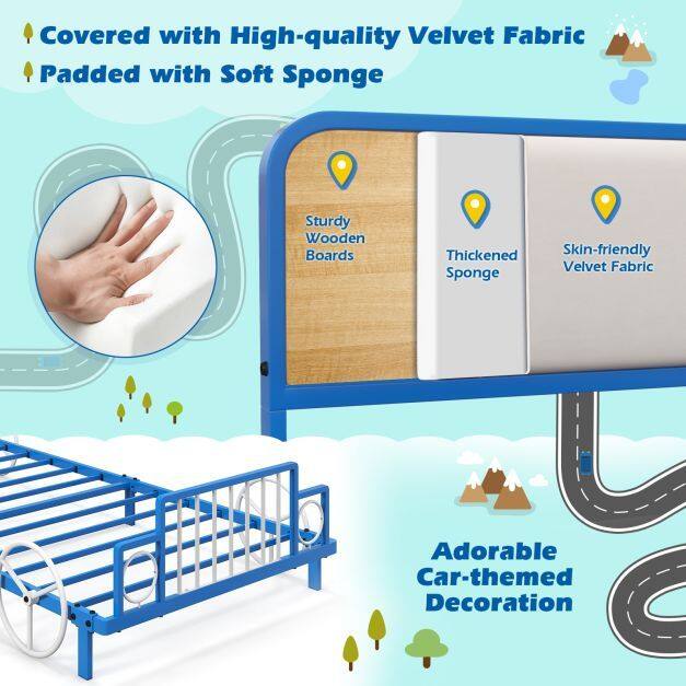 Looking for a bed that will make your child excited to go to sleep? Look no further than our adorable car-themed low-profile kids bed frame! Standing at 18cm high, this bed frame is perfect for young children who are just starting to assert their independence. It allows your kids to get in and out of bed easily. The velvet-upholstered headboard with soft sponge padding adds maximum comfort, while the sturdy wooden boards behind it ensure long-lasting quality. With a heavy-duty metal frame that can hold up to 160kg, this bed is definitely strong enough to support your growing kids. More details, like the safe round corners and protective foot pads, will bring better experience. Don’t wait any longer to give your child the perfect bed!