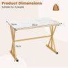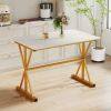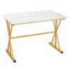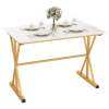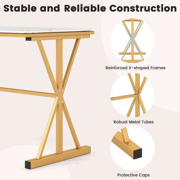 Our sintered stone dining table measures 110 x 70 x 75 cm (L x W x H), which is the perfect centerpiece for gatherings, whether in a cozy kitchen or a stylish dining area. The top-quality sintered stone tabletop, with a remarkable melting point of 1300 °C, not only delivers outstanding heat resistance but also ensures unparalleled durability. Moreover, the tabletop surface is smooth and scratch-resistant, making it easy to clean stains with a damp cloth. The robust metal frame, complete with stable X-shaped supporting bars, provides a reliable and safe structure, built to last. Adorned with a luxurious gold frame and a faux marble top, this table not only adds a touch of sophistication to your space but also elevates the aesthetic appeal of any room.