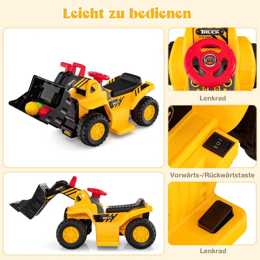 Our battery-operated ride-on bulldozer is an ideal gift for children ages 2 and up. With the help of two handles, children can manually operate the flexible arm and the bucket for shoveling or emptying, thus slipping into the role of a real construction worker. Working horn, engine sound, dump truck sound and car reversing sound provide a realistic and immersive experience. Meanwhile, children can also use our steering wheel, forward/backward button and foot pedal to control direction and achieve acceleration. And there are 3 balls and 1 folding basketball hoop for children to play. 4 premium wheels allow children to have fun on different roads. And if that doesn't convince you yet, this toy will be a great help to your child in improving certain skills such as fine motor skills and hand-eye coordination.