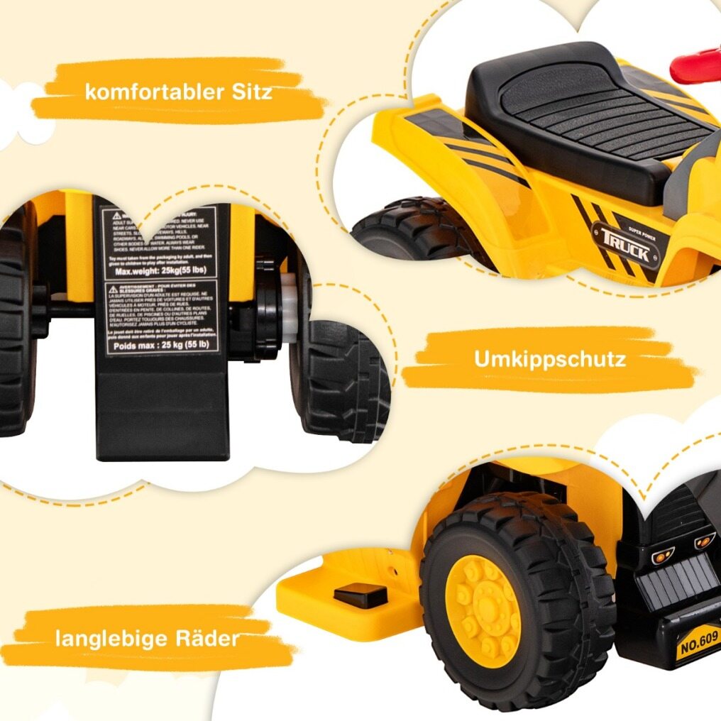 IDEAL GIFT FOR YOUR TODDLERS: Our bulldozer for kids is specially designed for children ages 2 and up. It supports up to 25 kg. The seat height of 25 cm makes it easier for children to sit and stand up. The rechargeable 6V battery provides 1-2 hours of playtime. And children not only experience the fun of driving, but also train their hand-foot coordination.