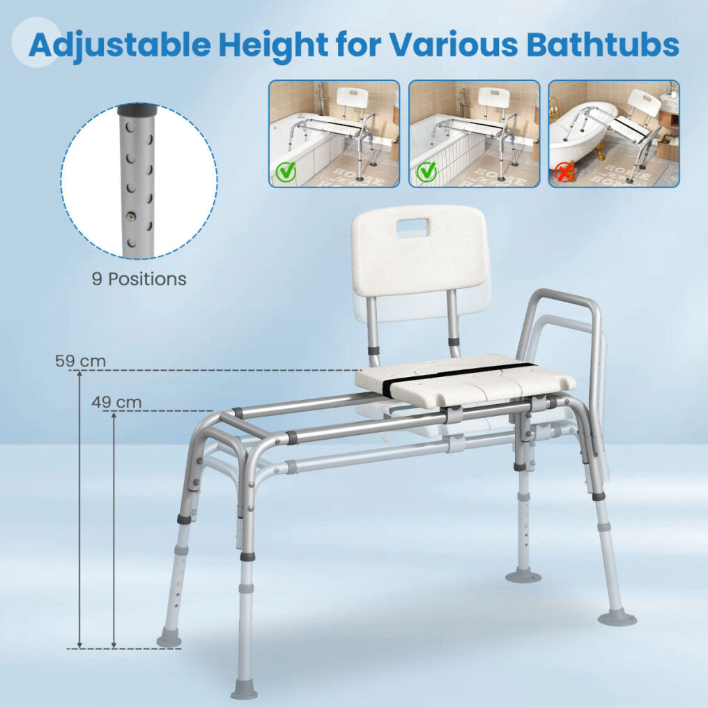 9-Level Adjustable Height: By tool-free adjustment, you can customize the seat height of this shower chair from 85-95 cm for personal comfort. Note: Fit most bathtubs and showers. Please check your bathroom first to ensure there is adequate space for placement and use.