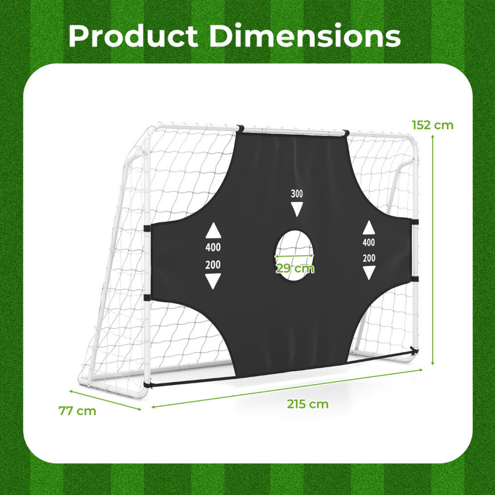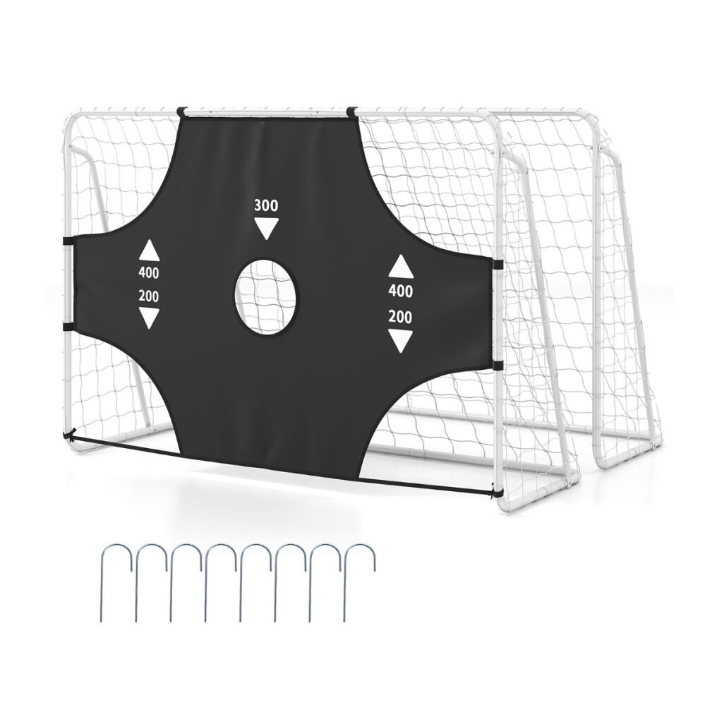 Upgrade your football training! Our football goal features removable nets with Velcro fastening, making it easy and convenient to set up and take down. Five shooting holes help you practice different shooting angles and improve your shooting technique. Made from sturdy metal tubes and tear-resistant Oxford fabric, the goal offers unparalleled durability! Eight ground stakes ensure absolute stability. No tools are required – assembly is quick and easy; everything you need is included! This football goal is perfect for the garden, park, or schoolyard and will improve your agility, concentration, and confidence. Come and experience the joy of football!