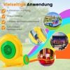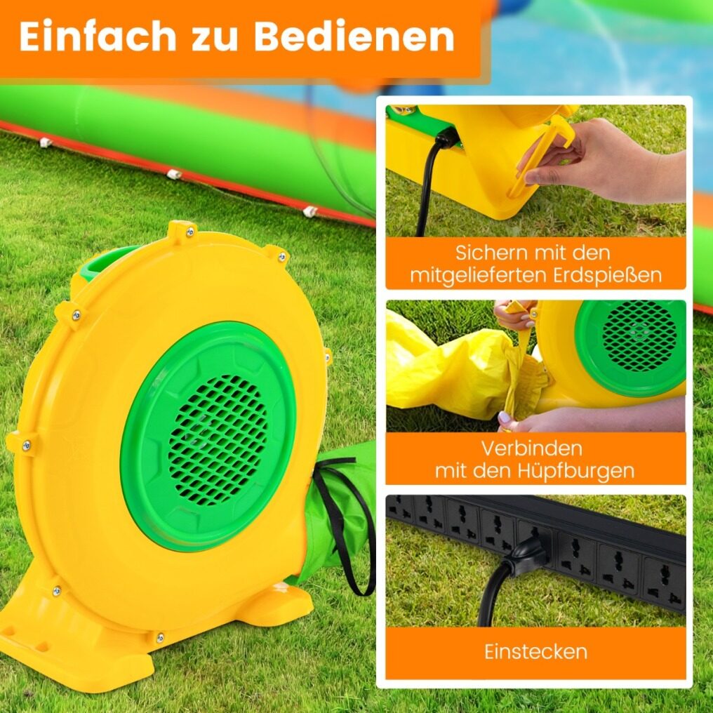 Unleash a whirlwind of fun with this powerful air blower - your ultimate ally for pumping life into any celebration! Watch it energize bouncy castles and slides in seconds and transform your backyard into a fun mile. Carry this lightweight blower anywhere thanks to its convenient handle and enjoy the freedom of effortless mobility. The included ground stakes let you secure it with peace of mind. And the thoughtful details, including the sturdy PP housing, safety switch and vent with mesh cover, add extra safety. Plus, it's super easy to use this air blower to inflate your inflatables! Simply connect to the inflatables and plug in. The energy-saving, low-noise companion for your inflatable festivities is here to revolutionize the way you set up your products!