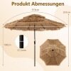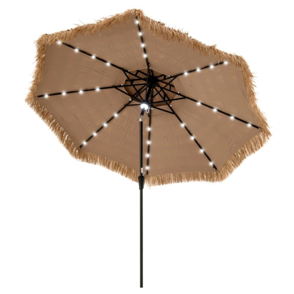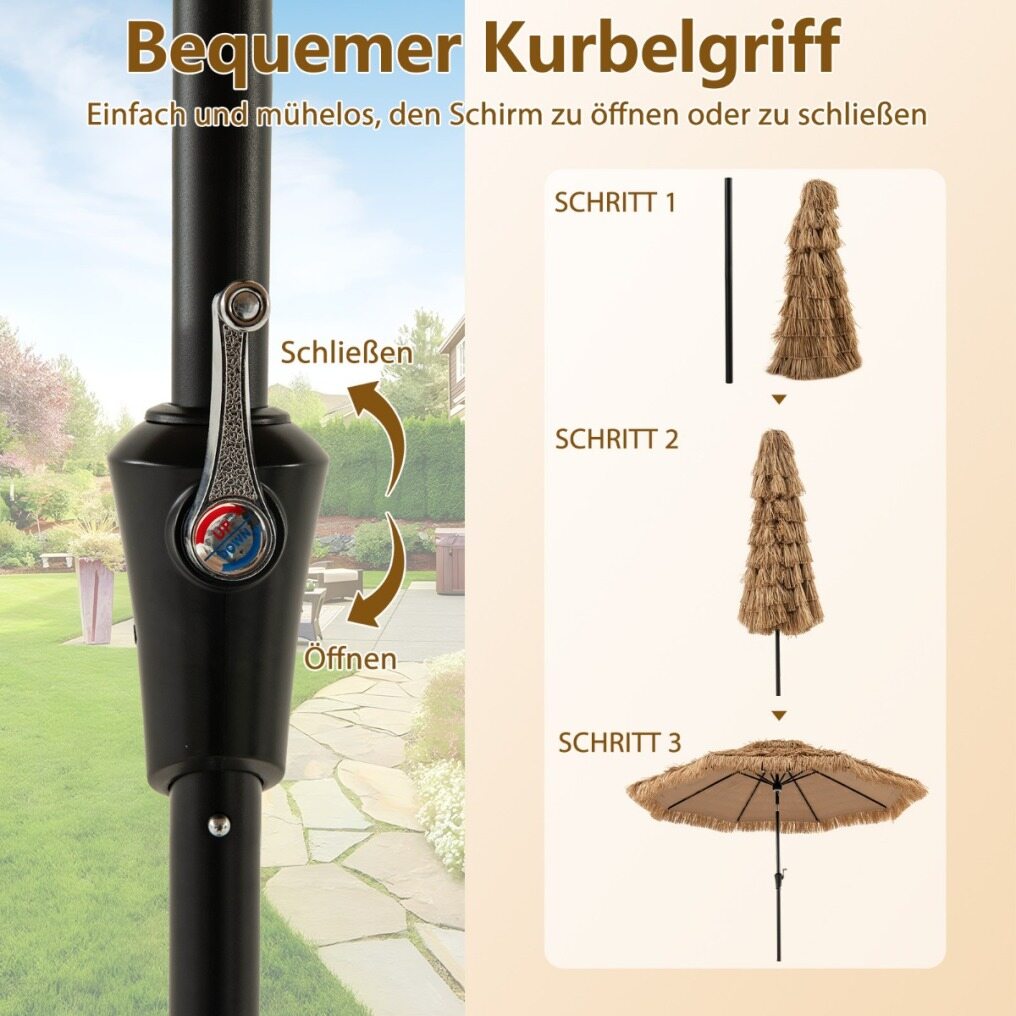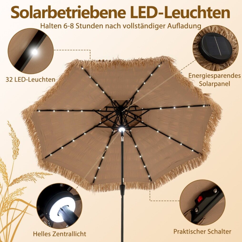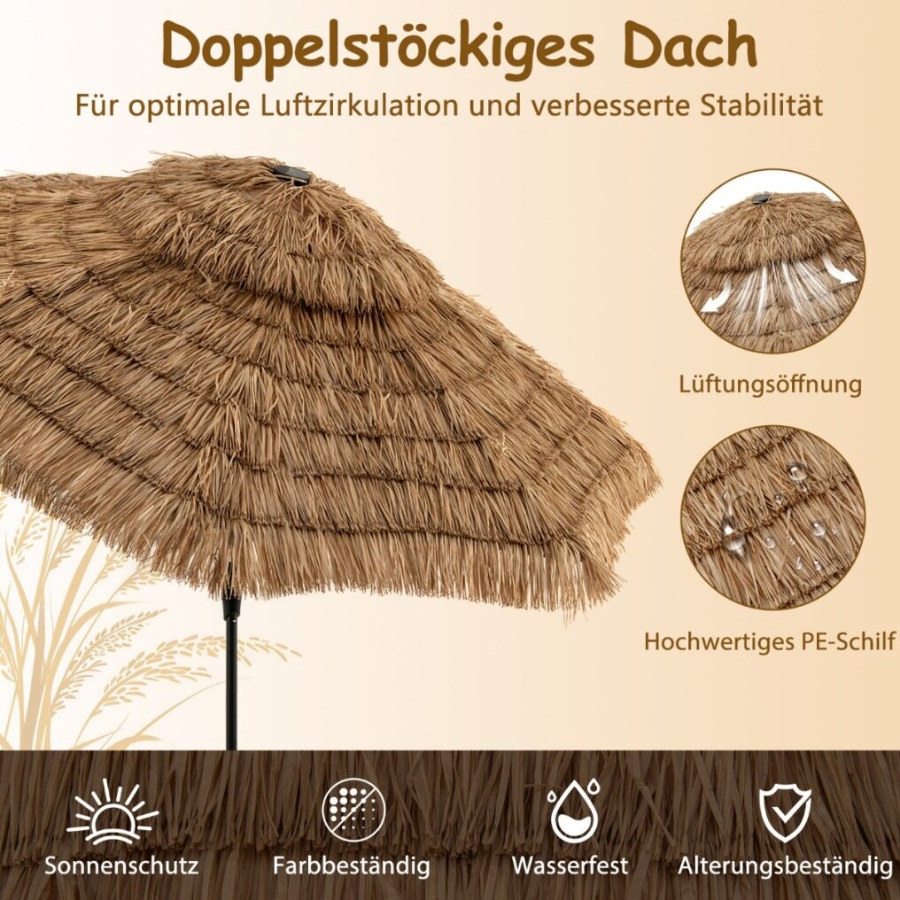 Our tiki umbrella with a hula thatch roof measures 313 x 251 cm (diameter x height) and exudes a tropical vibe. It's perfect for creating a Hawaiian beach atmosphere anywhere, from garden parties to beach picnics. The canopy can be flexibly tilted in different directions, providing a customizable shade area. It also creates an enchanting atmosphere for your evenings, with a bright central hub light and charming LED lights powered by a solar panel, providing 6-8 hours of warm and inviting illumination. The two-tiered roof, complemented by high-quality PE thatch, offers excellent protection from the outdoor elements while ensuring good ventilation under the umbrella. The eight sturdy metal ribs and the fastening safety latch further enhance its overall stability. Thanks to its practical two-piece design and straightforward crank, setting up and taking down the umbrella is a breeze.