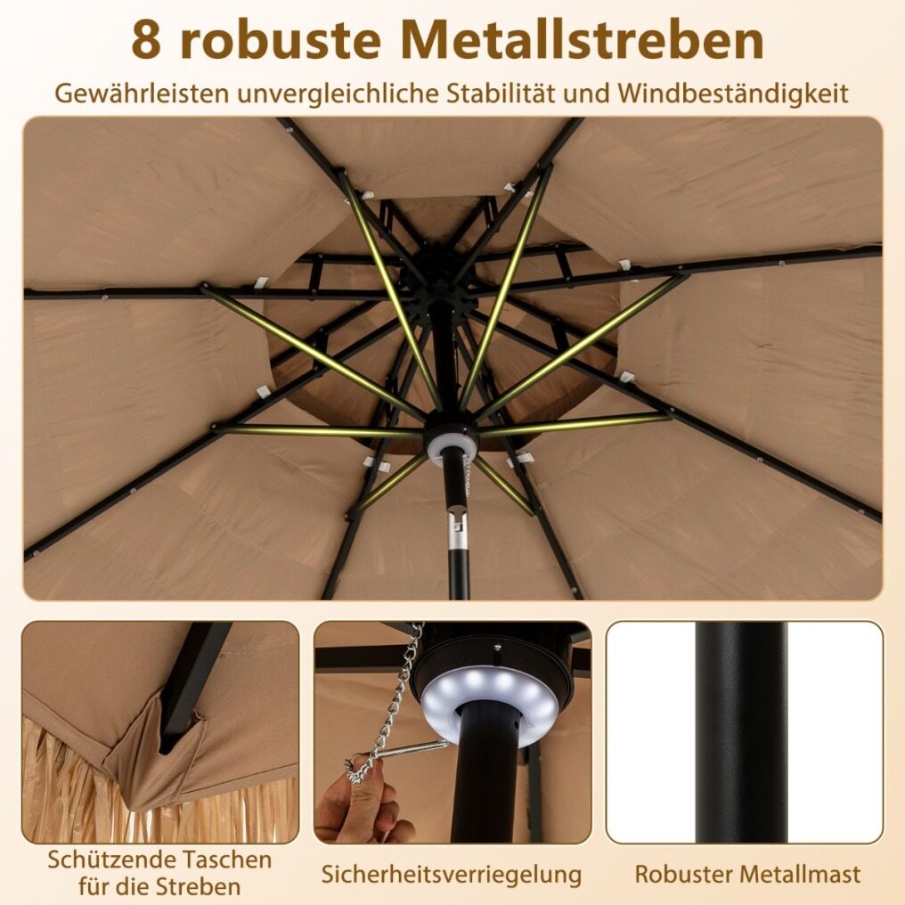 Stable and reliable structure: The patio umbrella is constructed from 8 heavy-duty metal ribs and a 37.5 mm thick metal pole, providing enhanced durability and protection against the elements. The canopy is securely locked with a safety latch to prevent unexpected closure.