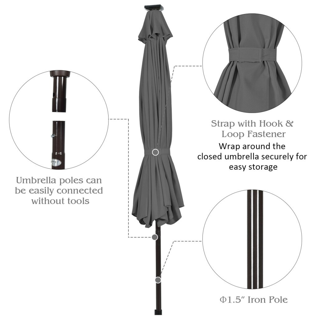Multi-functional Applications: Our patio umbrellas can provide shade during the day and light up the party at night. It is suitable for residential and commercial locations, as well as any outdoor area such as garden, poolside and beach. When not in use, the sewn-in hook and loop fastener straps can easily wrap the closed umbrella for storage.