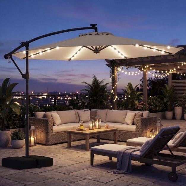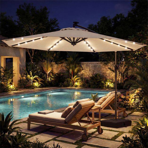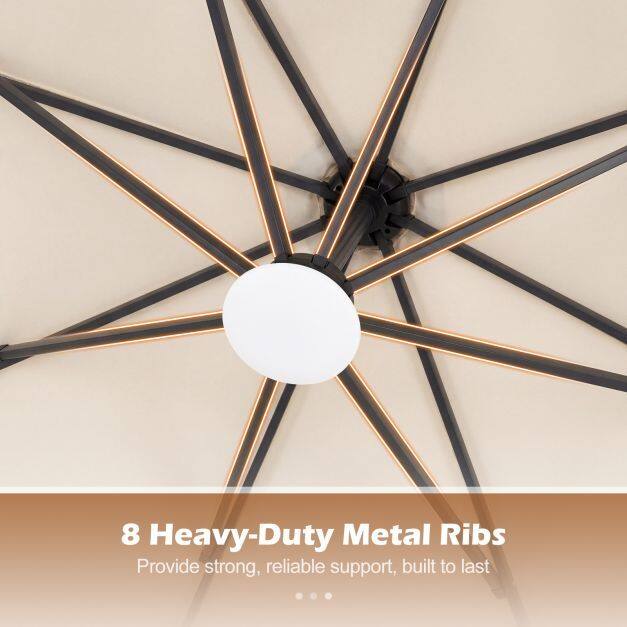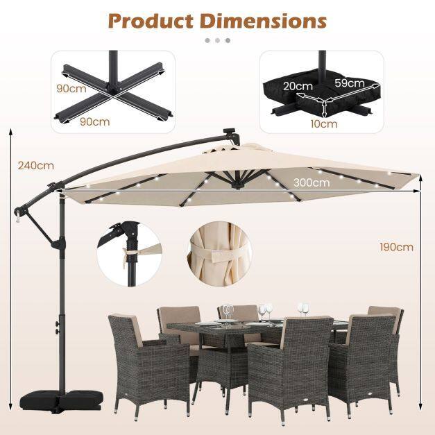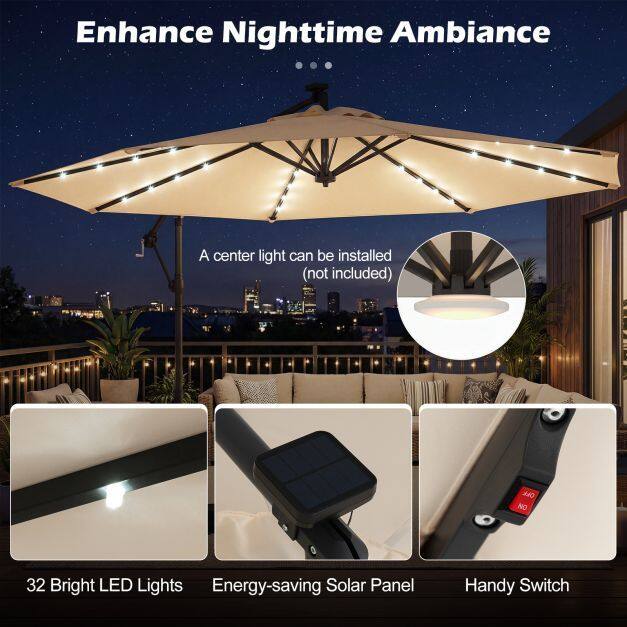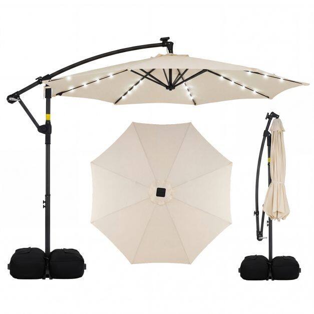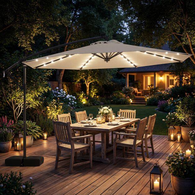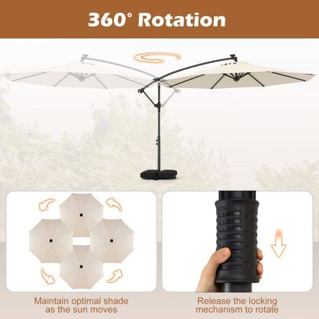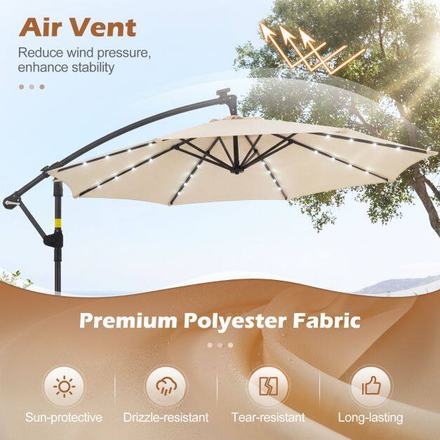 Premium Material: Enhance your outdoor space with our solar LED cantilever parasol, crafted from durable premium polyester fabric that offers sun protection, rain resistance, and tear resistance. Designed for longevity and stability, it includes a ventilation valve to minimize wind pressure and ensure it remains safe and functional in various conditions.