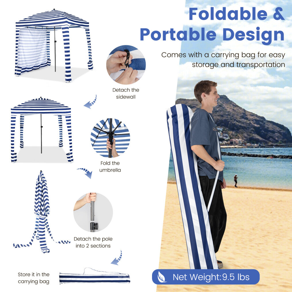● Foldable and Portable Design: The beach cabana can be easily folded into a compact size and comes with a carrying bag for easy storage and transportation. And it only weighs 9.5 lbs. It can be used for various outdoor activities, such as beach vacations, small parties, friend gatherings, backyard barbecues, lawn picnics, and more.